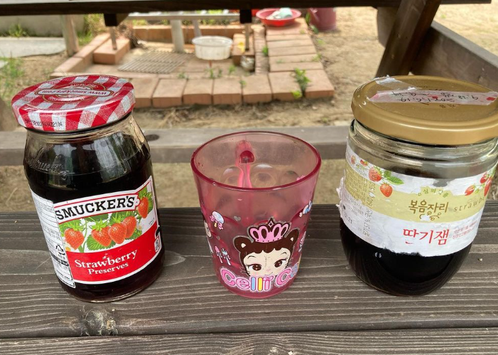 복분자주 - 이것도 설탕이 많이 들어갔는데, 복분자 자체의 향이 강하고 달 근한 맛이 강해서 정말 맛이 좋다. 이번에 먹으면서 느낀 건데 복분자주가 잘 맞네? 금방 취하는데 금방 깨고 뒤끝도 없다. 원래 다음 날 배탈 나는데 이건 그런 것도 없더라. 복분자주는 새가 많이 따먹었는데도 양이 많이 나와서 많이 담갔는데, 온 손님도 작은 페트병 하나 따라가고 인기가 좋았다. 남편 놈도 친구랑 둘이서 놀며 곤드레만드레 퍼마시고. 올해는 새를 내쫓는다고 남편이 새망까지 샀다. 남편의 최애 술이 되었다. 이것도 올해엔 설탕 조금만 넣다. ㅎㅎ 나는 이대로도 좋긴 한데?