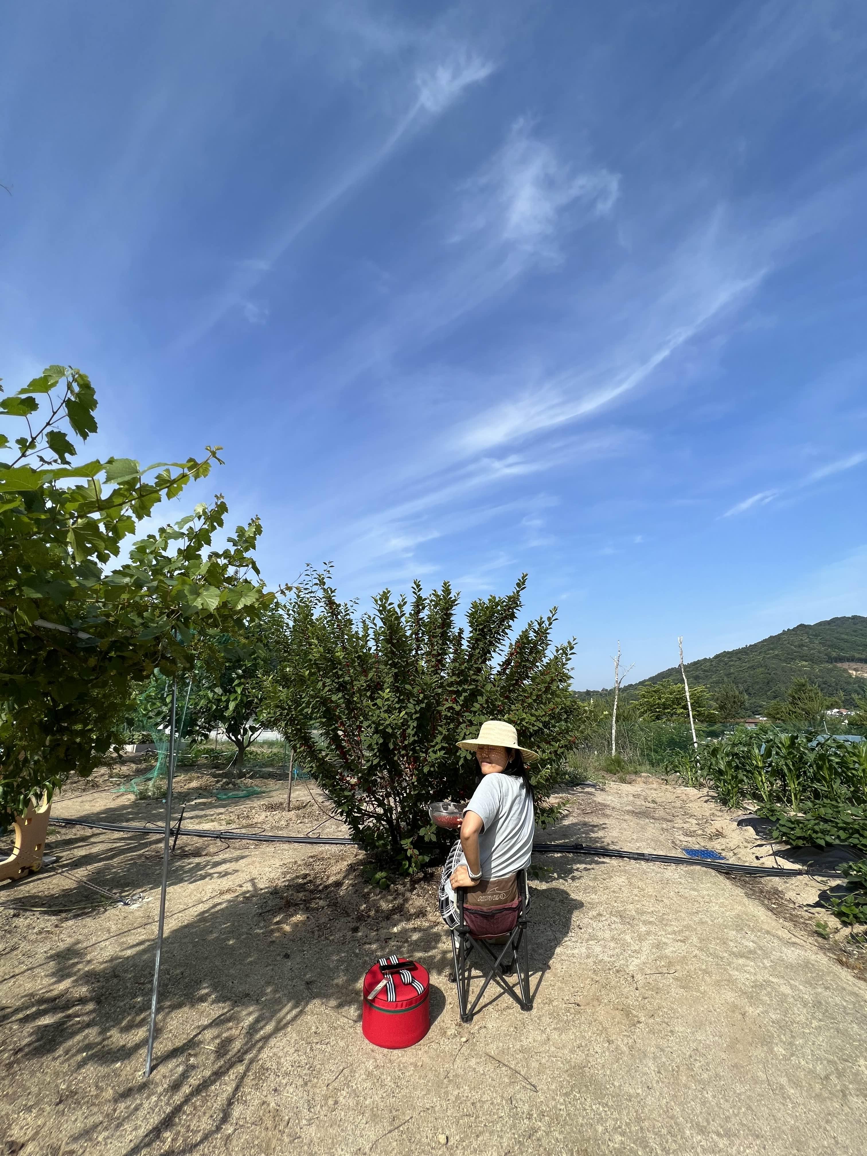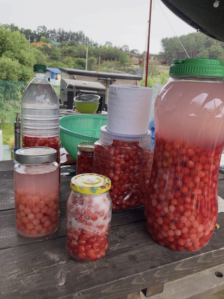 음 눈감았네요…. 여기 모든 나무들이 그렇지만, 앵두나무는 일년 사이 두배는 컸네요. 그러다보니 소출도 두배~ 열심히 땄는데도 1/5도 못따고~~~한가득 따서 앵두청과 앵두주를 담궜지요. 나머지는 저녁에 다시~~