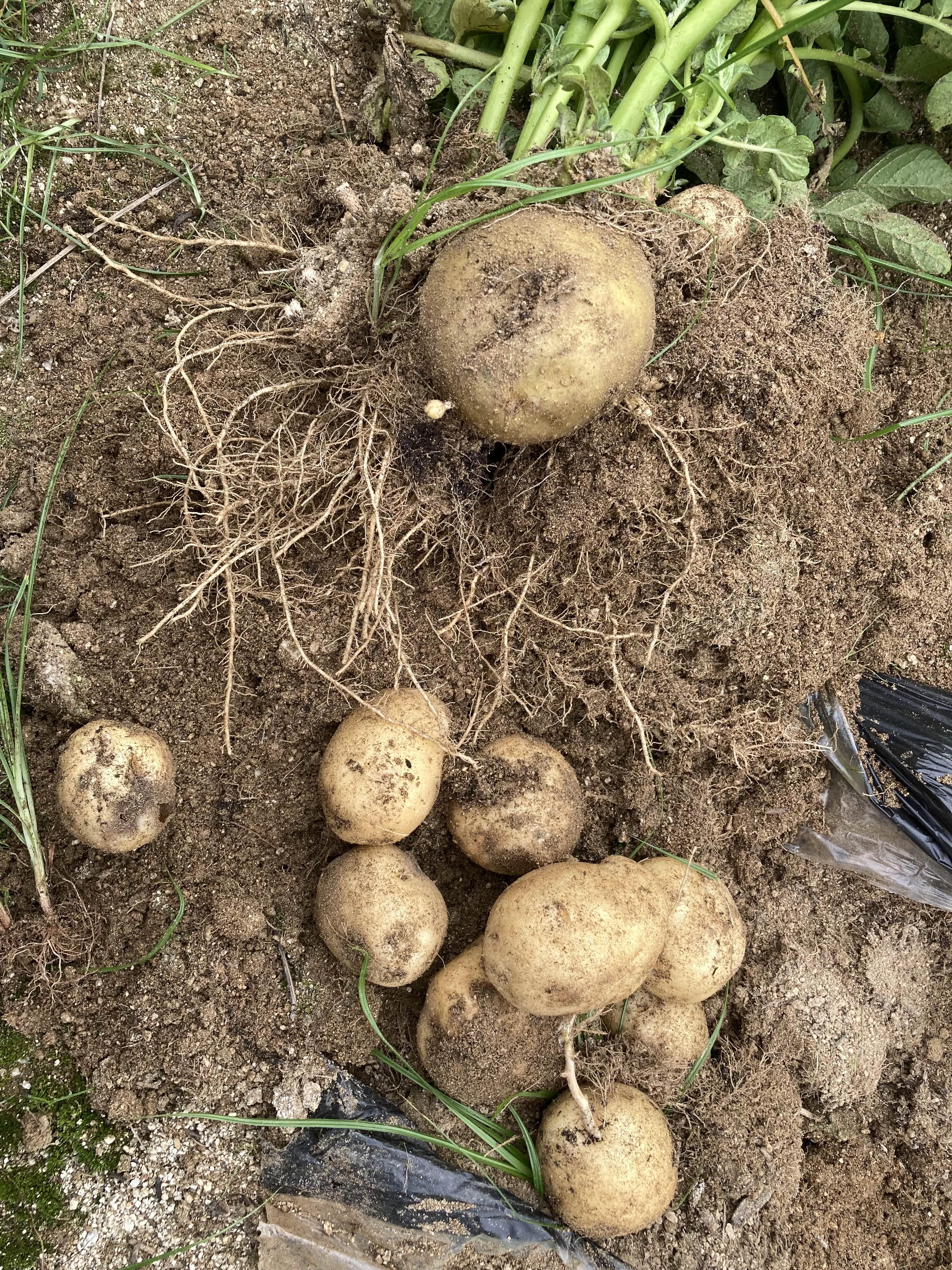 음.. 그런데 생각보다 알이 굵지 않아서 두 뿌리만 뽑고 나머지는 다음주에 뽑기로 했습니다. 남편이 심은 곳이 좀 더 알들이 많이 붙었더라고요. 제가 좀 깊이 심지 않아서 잔소리 듣고 다시 심었는데, 반항하는 마음에 많이 깊이 심었더니 싹이 좀 늦게 나오더라고요. ㅎㅎ