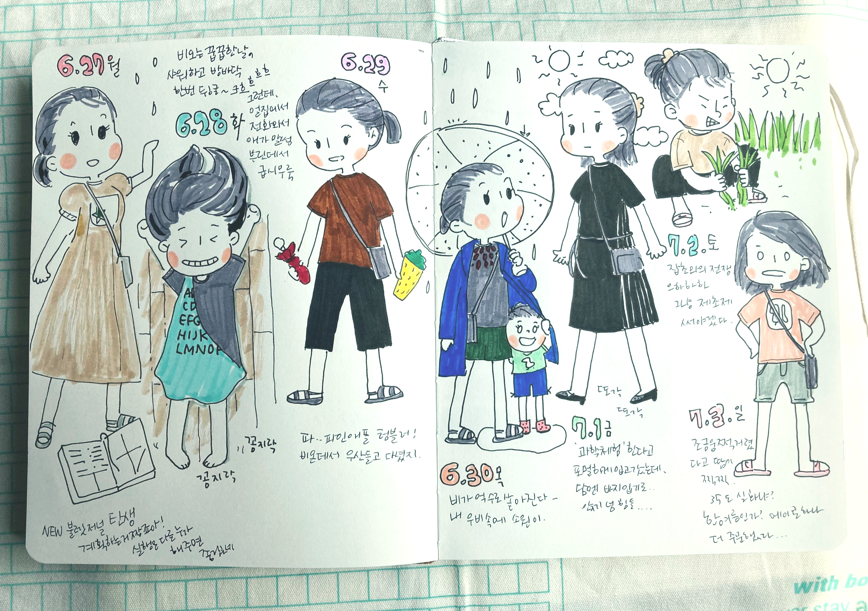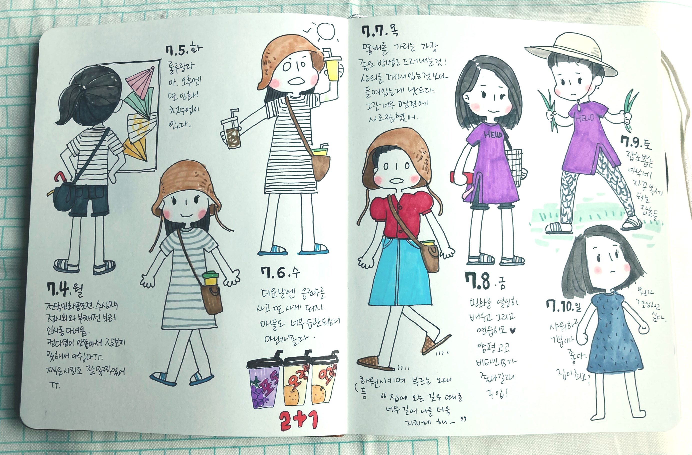 왜인지 [6/27~7/2 룩북]은 마음에 들지 않아 이번주 것과 같이 올립니다. ㅎㅎ 아무래도 붓끝이 갈라져서 마구잡이로 채색되어서 그런 듯?
