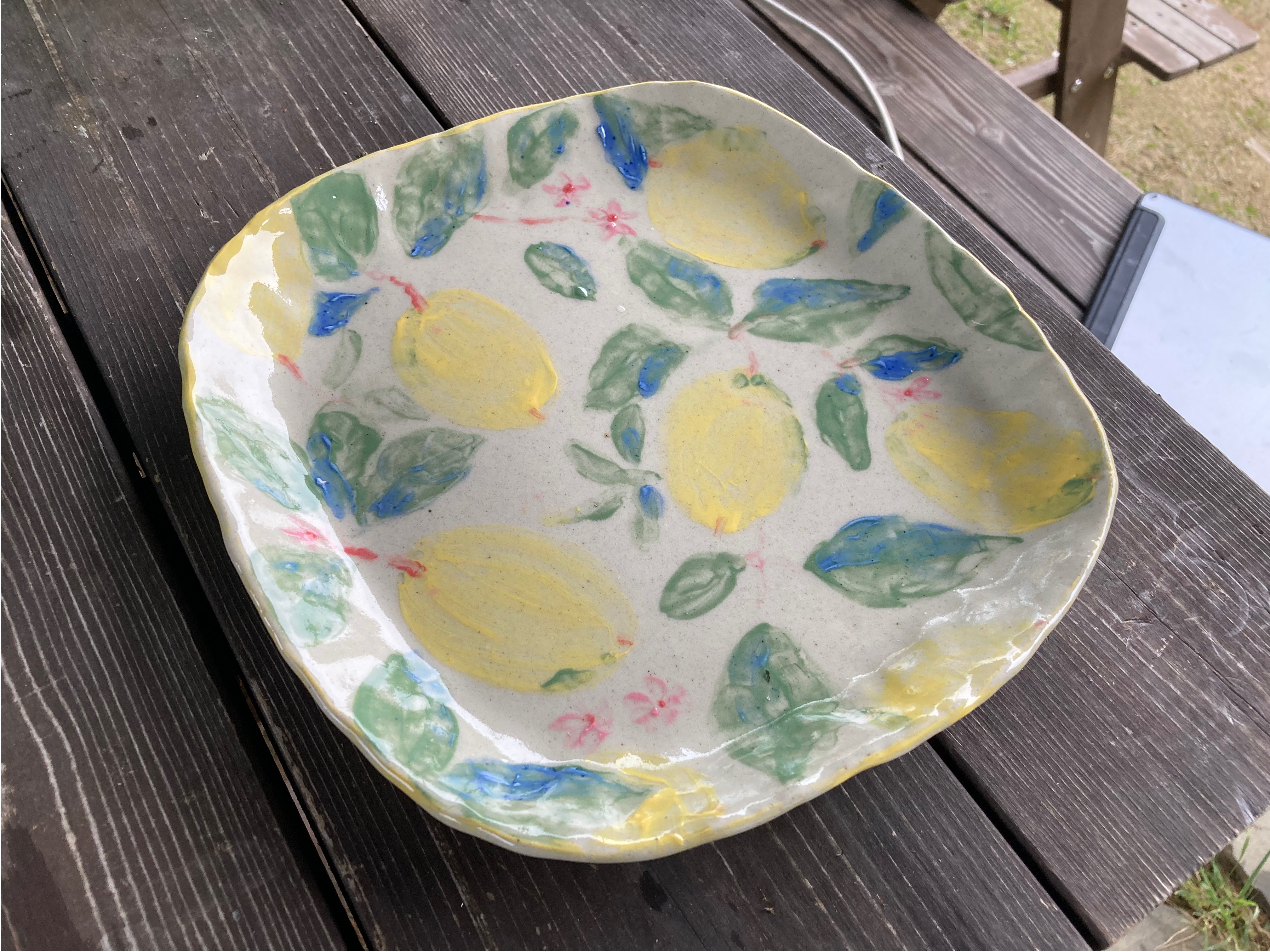 저는 레몬과 레몬꽃이 있는 접시를 만들었어요. 접시부터 만들었는데, 쉽지 않더라고요. 팔목을 꺽어 누르지 않고 세우듯 형태를 잡아주는 데 팔목도 아프고 자꾸 힘들이 들어서 형태가 좀 늘어졌어요. 선생님이 여러번 지적해주셔서 겨우 완성했네요. 그리고 원래 예상하고 갔던 게 아닌지라 들어갈 그림은 급하게 검색해서 그렸고요. 채색은 체험용인지라 몇가지 되지 않았어요. 예시로 보여주신 책이 거의 오방색에 가까워서 결과가 어떨지 모르겠네요.