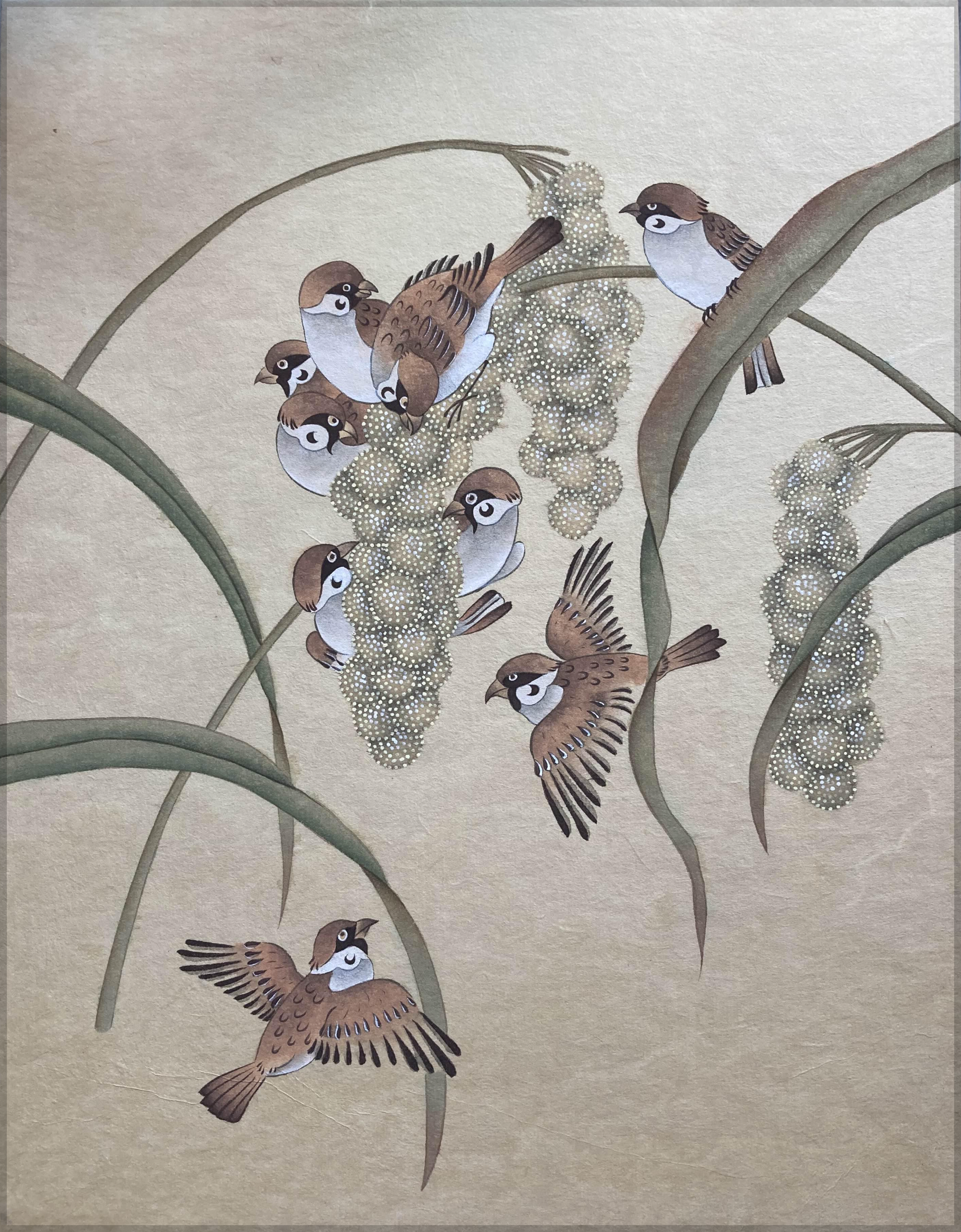우리나라는 숫자 9를 좋은 의미로 쓴다고 참새 9마리로 본을 만들어 주셨어요. 제가 좋아하는 식물이 민들레이고 좋아하는 새가 참새인지라 너무 즐겁게 작업을 했어요. 보기보다 색이 많이 들어가서 정말 바쁘게 작업을 했네요. 참새 의미가 자손 번영, 관직 이런 의미라고 합니다. 자손이 잘되라는 거지요. 저도 애가 있다 보니까 그릴 수록 아이들을 생각하게 되어요. 이 그림을 그리며 아이들의 행복과 번영을 기원했어요.