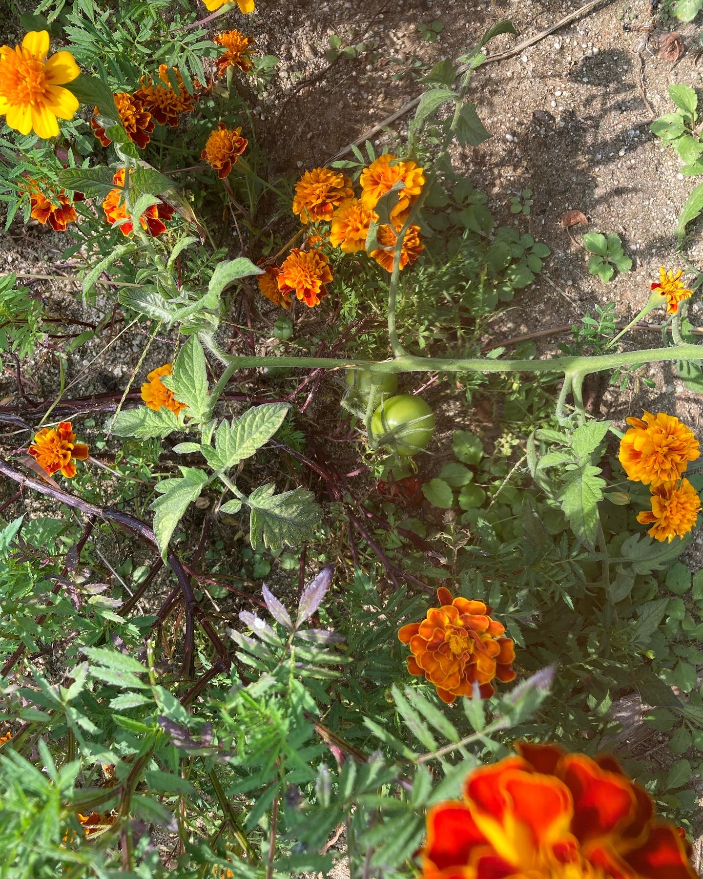 이주 만에 왔더니 희한한 곳에서 농작물들이 또 자라고 있어요. 대추나무와 메리골드 사이에 토마토가 자라고 있어요. 어째서지??? 원래 토마토 밭과도 먼 곳인데 말이죵…??