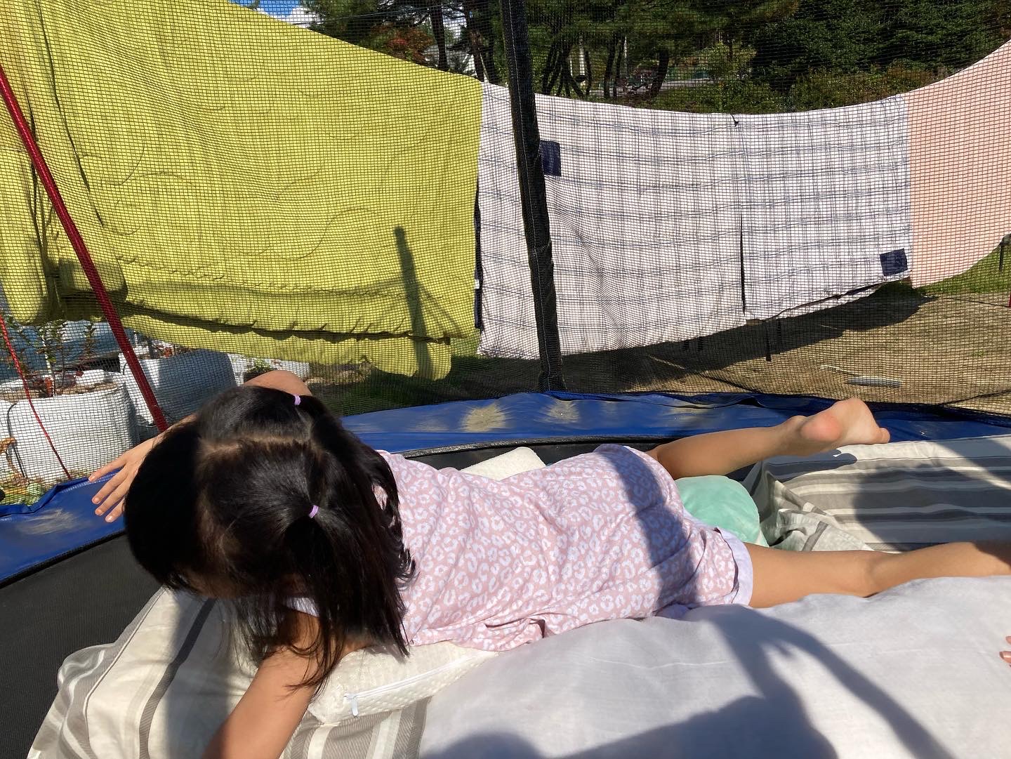 농막은 늘 흙먼지라 이불에 많이 쌓여요. 햇볕이 좋길래 이불넣어 털고 베개들은 방방이에 올려 소독하고 했어요. 아이들도 좋다고 들어오고 조도 베개 껴안고 파란 하늘의 흰구름 보며 시간을 보냈어요. 이런게 행복이지요. ㅎㅎ