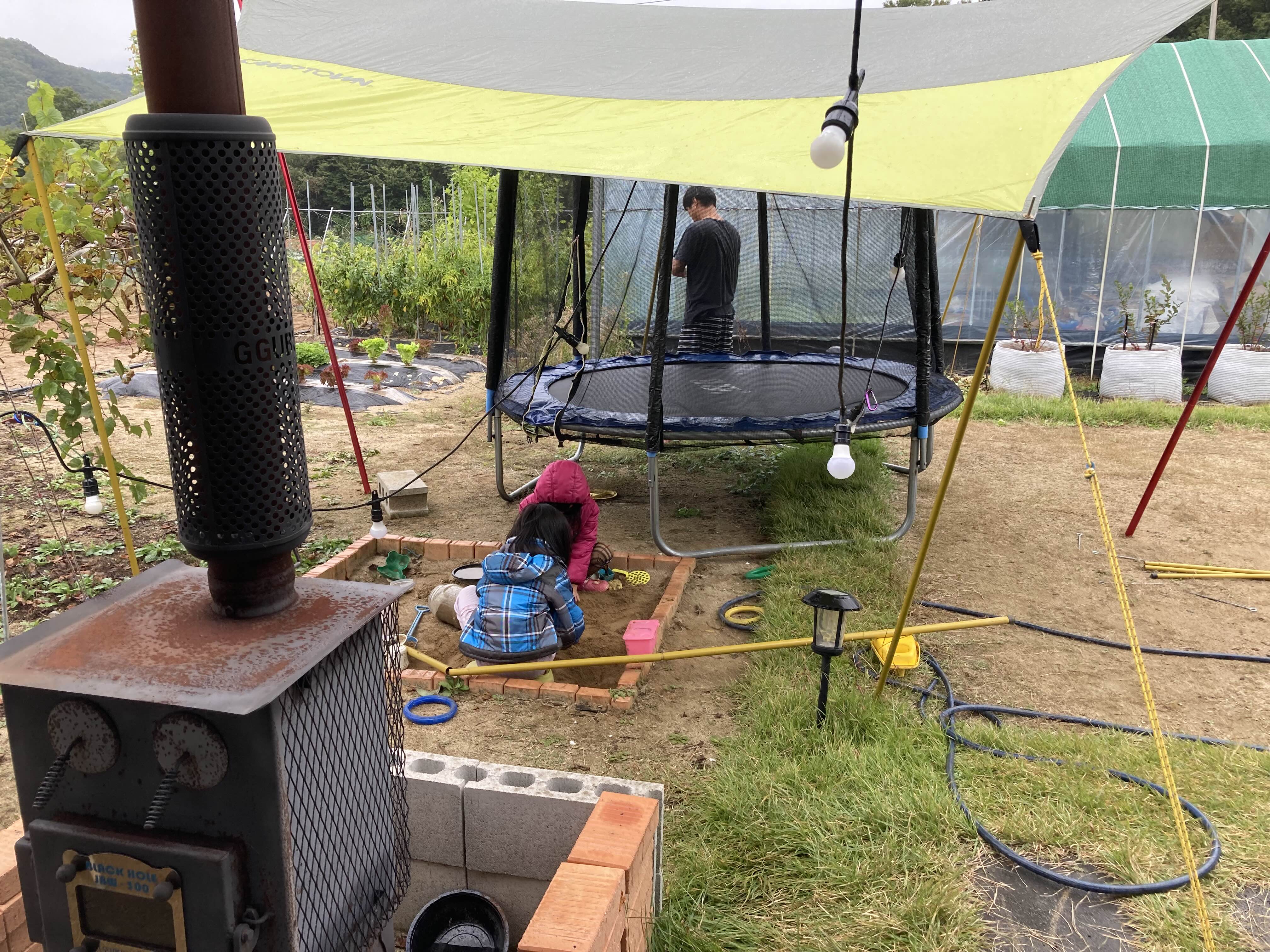 비 오는 날 바깥 놀이를 위해 텐트를 설치했어요. 방방이도 타고 흙놀이도 하고요. 갑자기 추워진 날씨로 잘 놀까했는데 흙 놀이를 참 열심히 합니다. ㅎㅎ