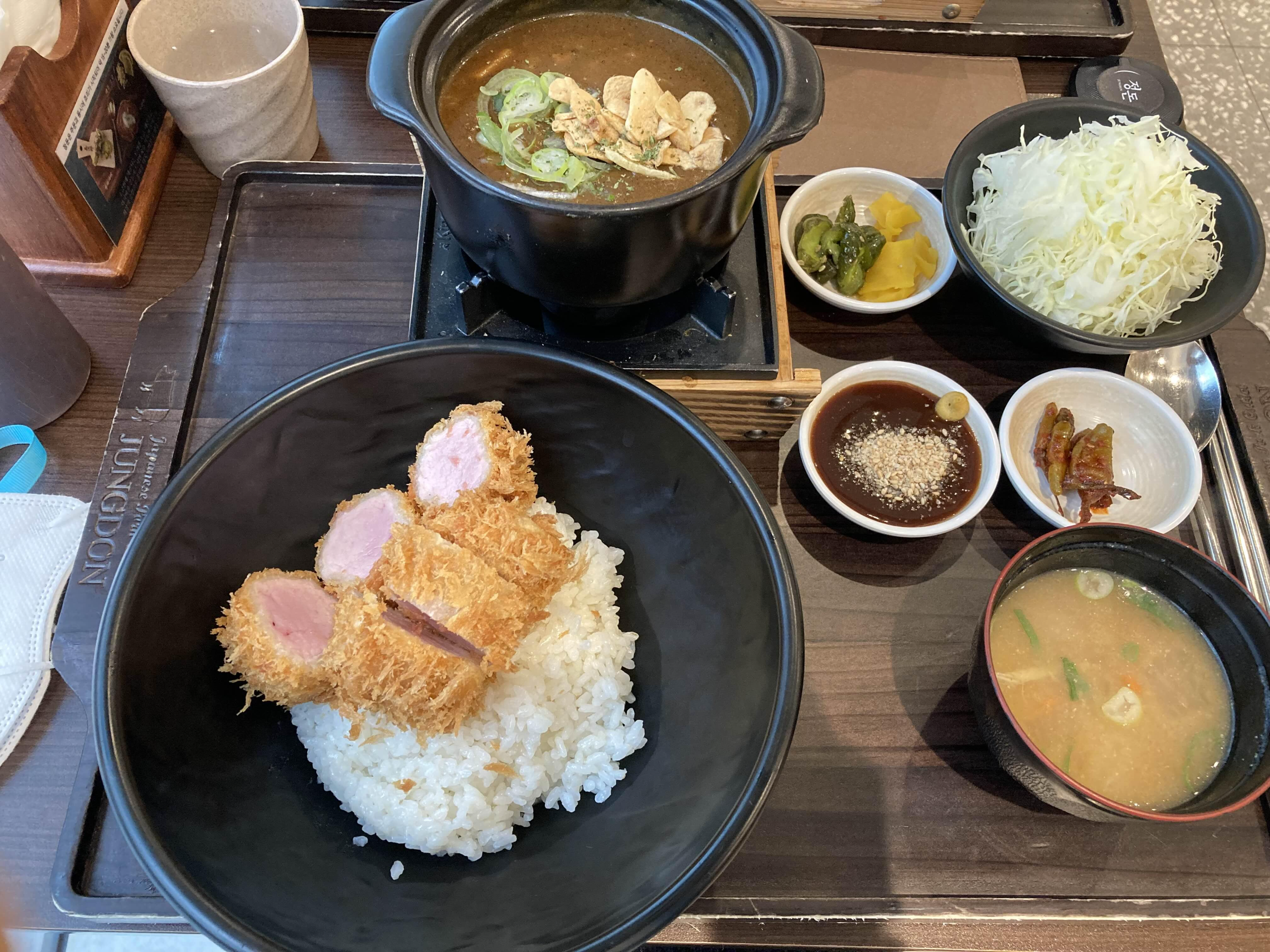 고든램지 피자 레스토랑도 있었지만, 아는 맛을 더 찾는 나이인지라 돈가스를 파는 곳으로 들어가 자리를 잡았답니다. 요리는 좀 늦게 나오는데, 받아보고 고객을 끄덕였습니다. 카레가 작은 화로 위에 나오고요. 계속 보글거리며 끓더라고요. 친구는 치킨 카레를 시켰는데, 제가 먹어본 치킨 카츠 중에 제일 맛있었어요. 대체로 부드럽습니다. 밥은 꼬들거려서 먹기 좋고요. 반찬들은 간이 좀 세다는 느낌이 들었는데, 유연한 카츠들과 잘 맞는 듯합니다. 카레는 매운 정도를 고를 수 있었는데, 약간 매운맛 하길 잘했다 싶어요. 부드러운 느낌의 카츠를 먹다 보면 조금 느끼해질 수도 있으니 말이죠. 가격은 1.5만 원 정도인데, 양이 푸짐해서 가격 대비해도 대만족이었어요. 나올 때 12시즘되었는데, 줄 서기 시작하더라고요.