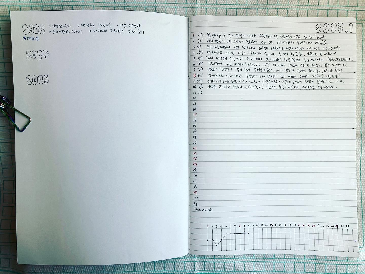 이 5년 다이어리는 한 페이지당 한달로하고 하단에 감정그래프도 넣어봤어요. 한 달 해보고 다음 날 어떻게 바꿀지 고민해 보려고요.