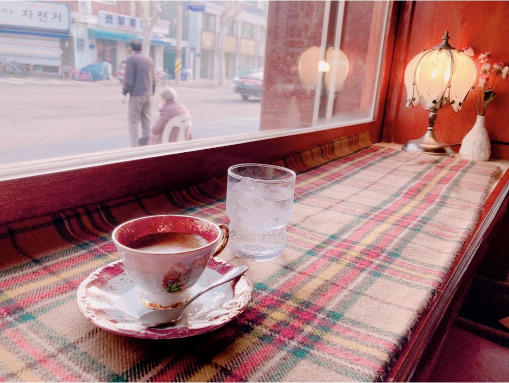건물 모서리에 있는 커피숍은 한강에스프레소라는 곳이고요. 분위기가 시간을 거슬러 간 듯한 느낌이에요. 음악도 편안해서 생각보다 오래 앉아 있었어요. 입맛을 씻어줄 얼음탄산수가 먼저 나왔고요. 시킨 연유에스프레소를 한입 음미하고 뒷맛이 산미가 있어 탄산수로 씻어내려 주며 조금씩 마셨어요.