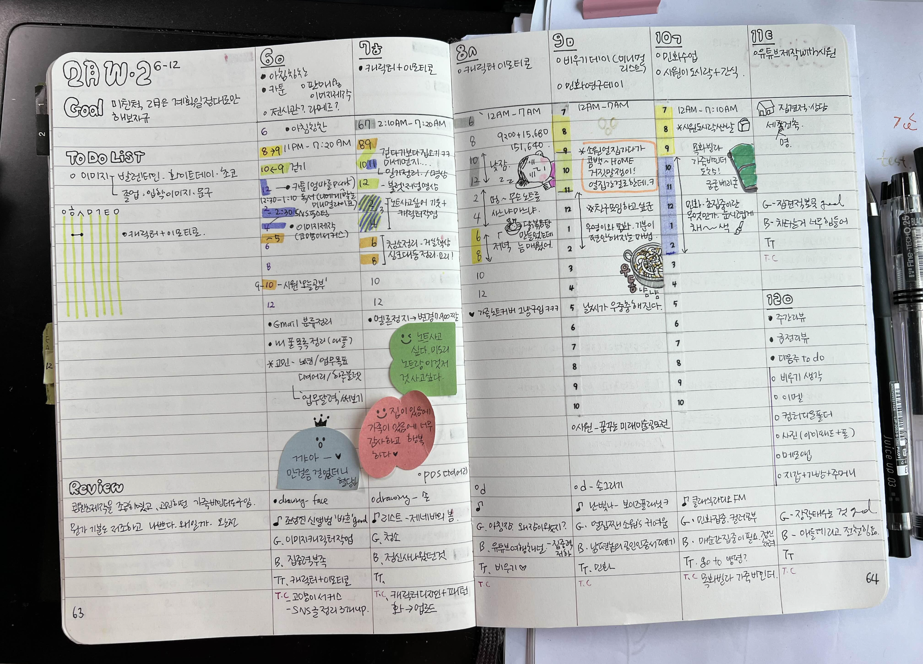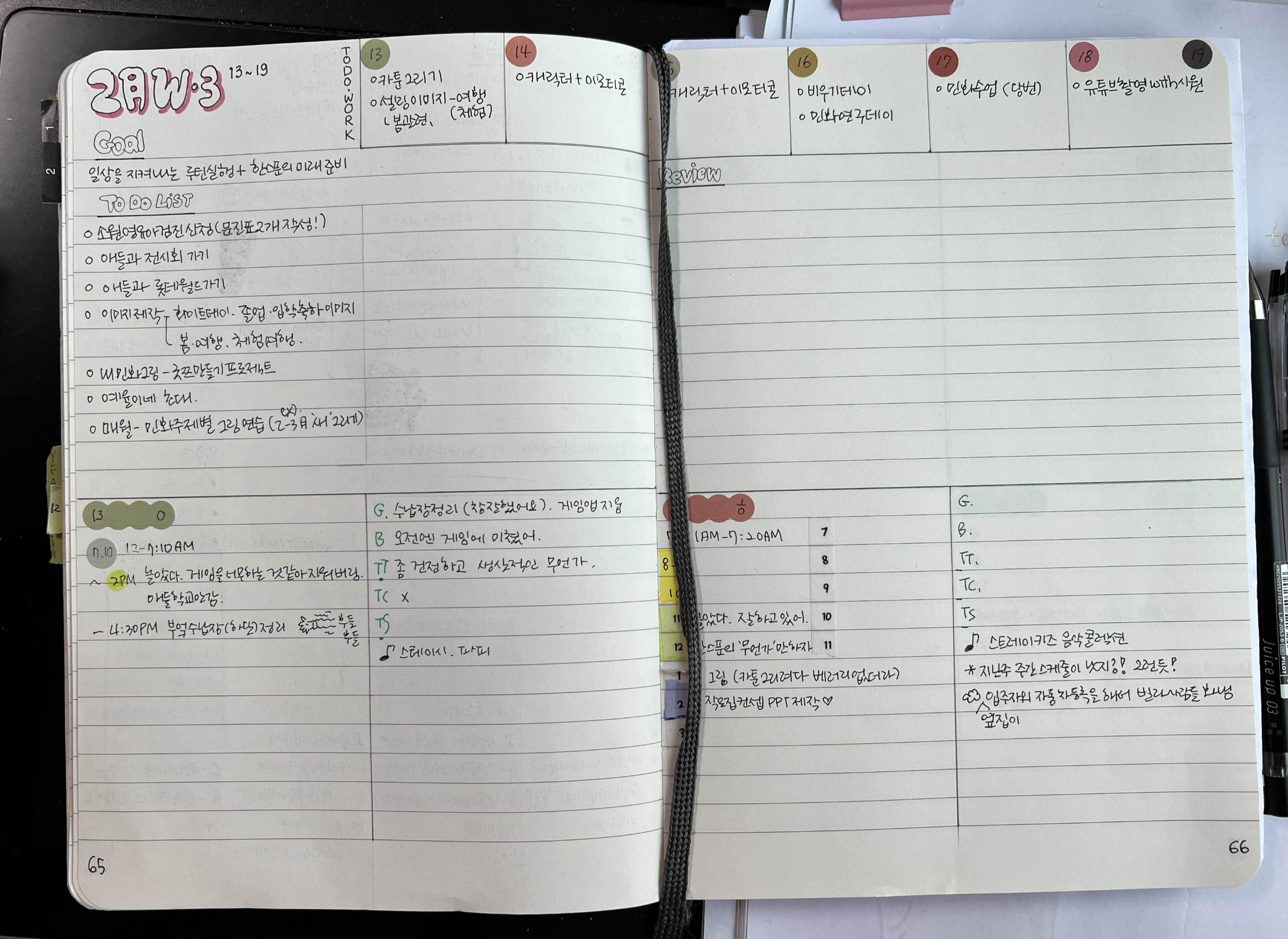 주간 업무나 꼭 해야할 것들을 따로 노트로 빼려다가 상단에 한두 줄만 적자는 생각으로 넣었는데 괜찮은 것 같아요. 다음 달에는 월간 할 일은 좀 더 세부적으로 나눌 거고요. 집안일도 나눠야지요. 나태하면 나태한대로 적고 열심이면 열심인 채로 적고, 딱히 성장한다기보다는 그저 하루를 기록하는 취미로써 적어나갑니다. 쭉쭉쭉