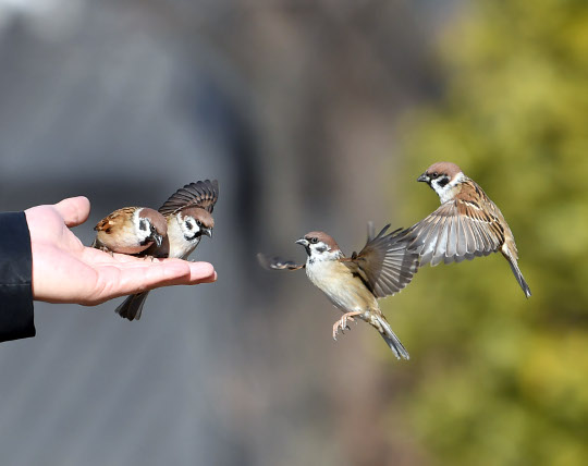 기쁨과 행복 참새는 까치처럼 즐거움을 상징하는 길조(吉鳥). 일상의 소소한 기쁨과 활기찬 에너지를 표현.