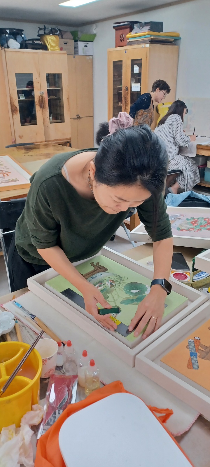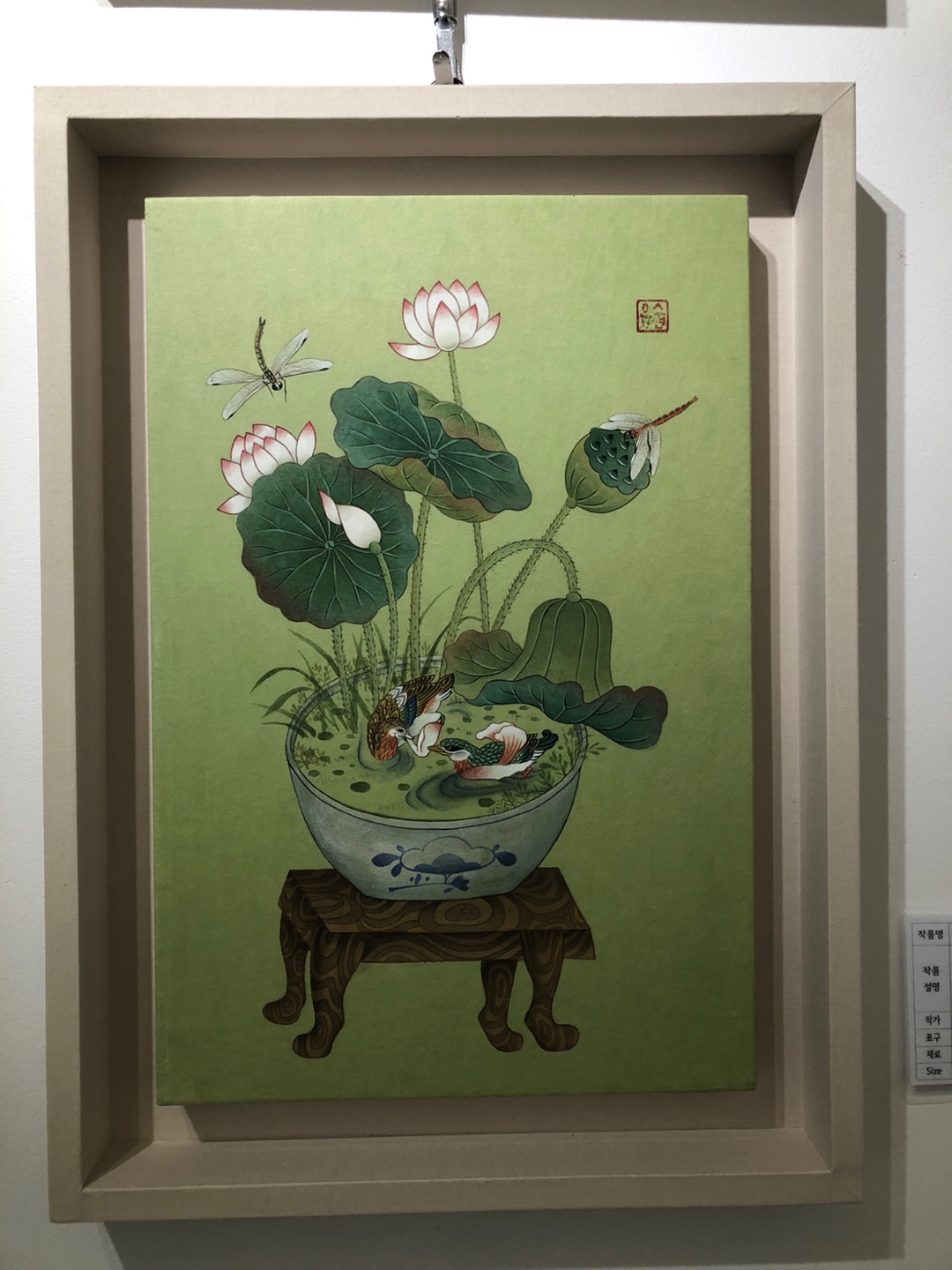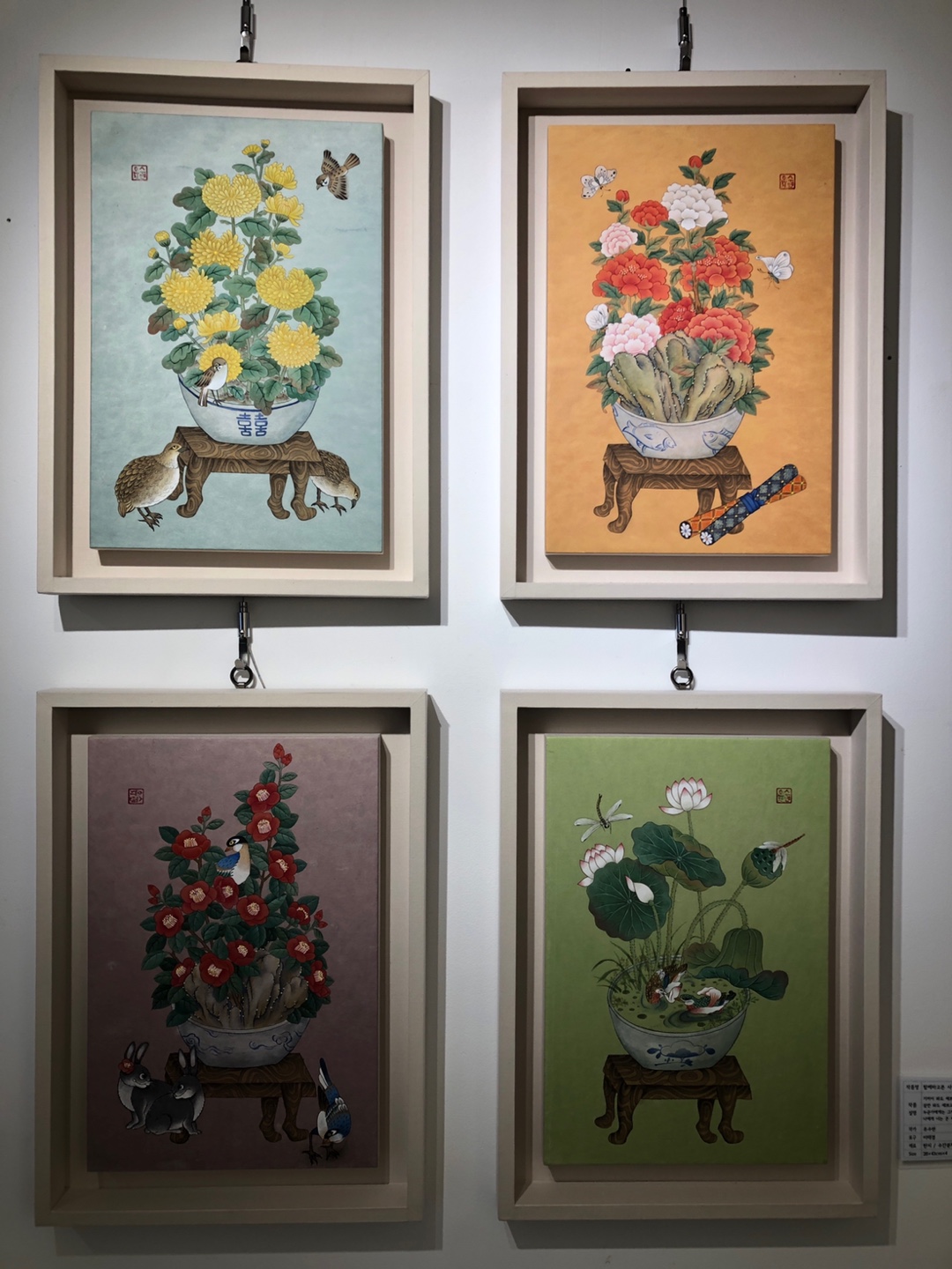 제 작품은 이렇게 4점이여요. 창작에 가깝고요. ㅎㅎ 연꽃그림은 기존 본을 다소 변형한 형태입니다. 저희 민화반 명장 김희선 선생님의 지도아래 본을 만들어 그렸어요. 표구는 표구반이자 민화반이신 이태경작가님께서 해주셨답니다. 흐흐흐