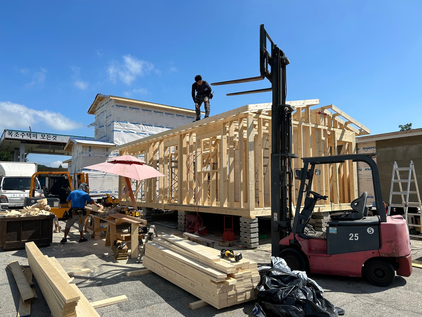 아 작은 집이긴한데 이렇게 보니 참 작네요. 저기 나무로 짓고 있는 부분이에요. 장마기간 중이라 일요일 오후에 비가 오기전까지 지붕 얹는 걸 목표로 열심히 하고 계시데요.