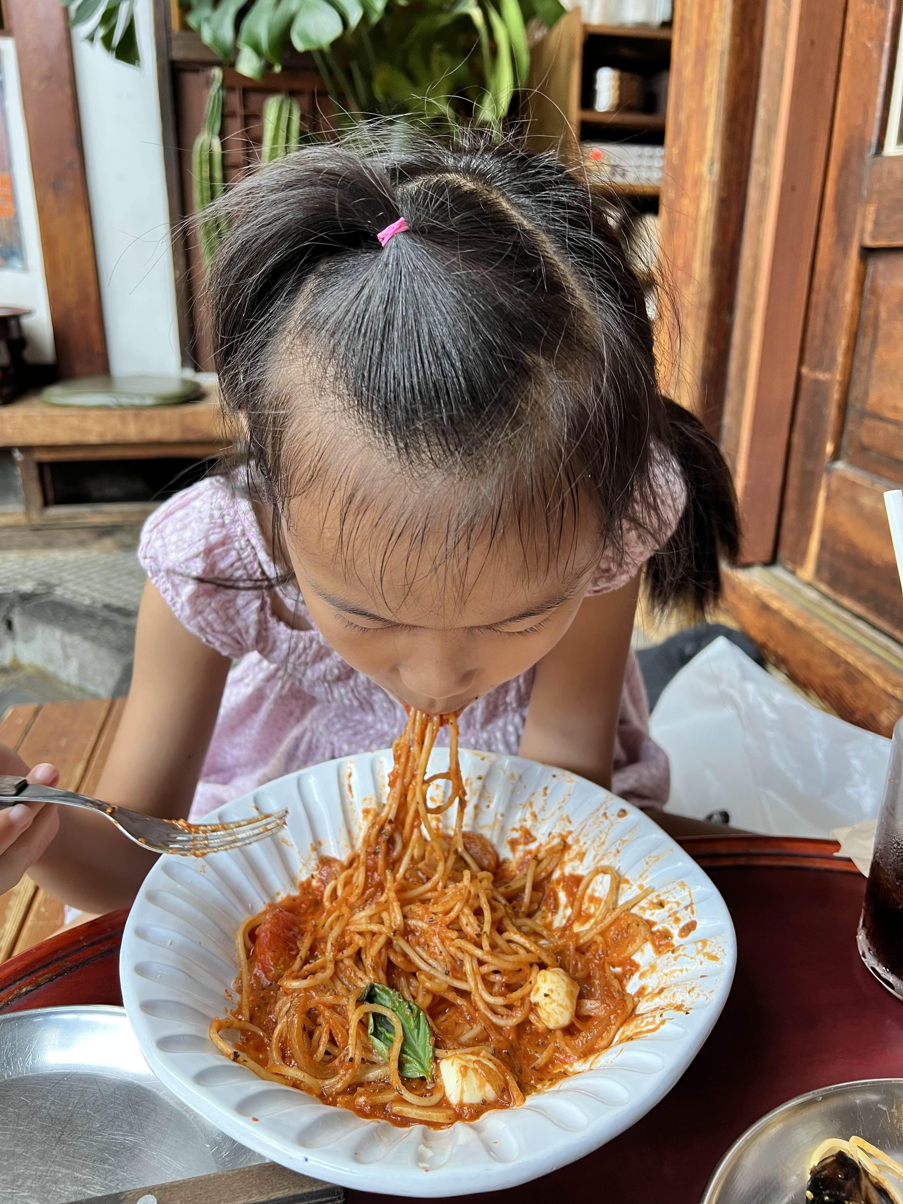 외식은 가볍고 저렴한 거 위주로 먹는데, 여기 물가는 참... ㅎㅎ 커피한잔도 너무 비싸네요. 한옥파스타 집에 가서 아이는 성인 1인분을 다 먹고 올챙이 배가 되었고요. 저는 더위를 날려줄 맥주와 상하이파스타(안 맵게 했는데도 매운..)를 먹었어요.