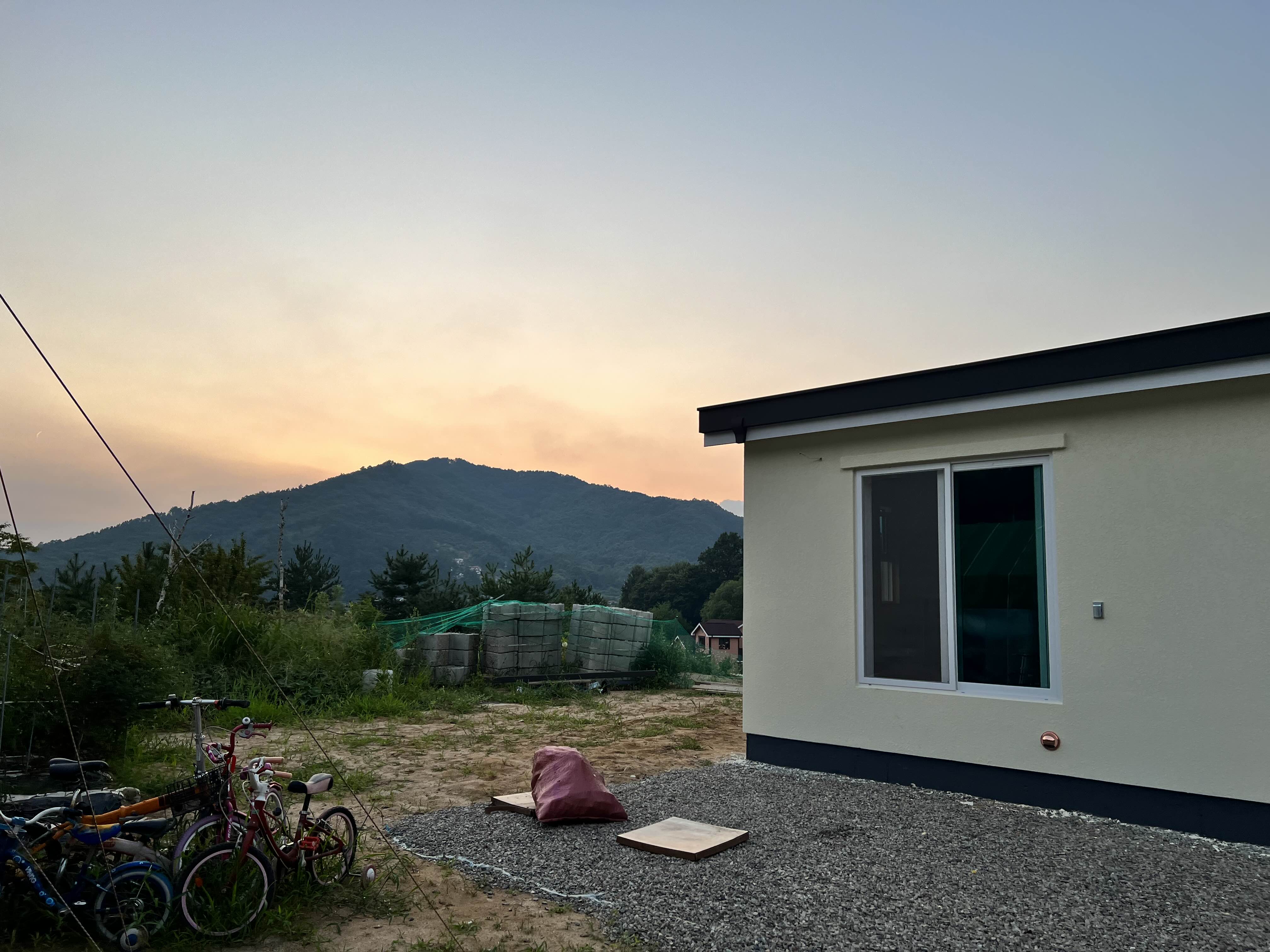 제가 있는 상태에서 첫번째 <집과 일몰>입니다. 내부에서는 서쪽에 작은 창 하나만 있는데, 일몰이 잘 보이더라고요. 겨울이든 여름이든 잘 보일 것 같아요. 내부마감이 덜되어서 아직 사진 같은 건 남기지 않고 있어요. 준공허가가 난 후에 물건 넣고 꾸미자고 남편이 하드라고요. 원리원칙에 민감한 분이십니다. 허허허