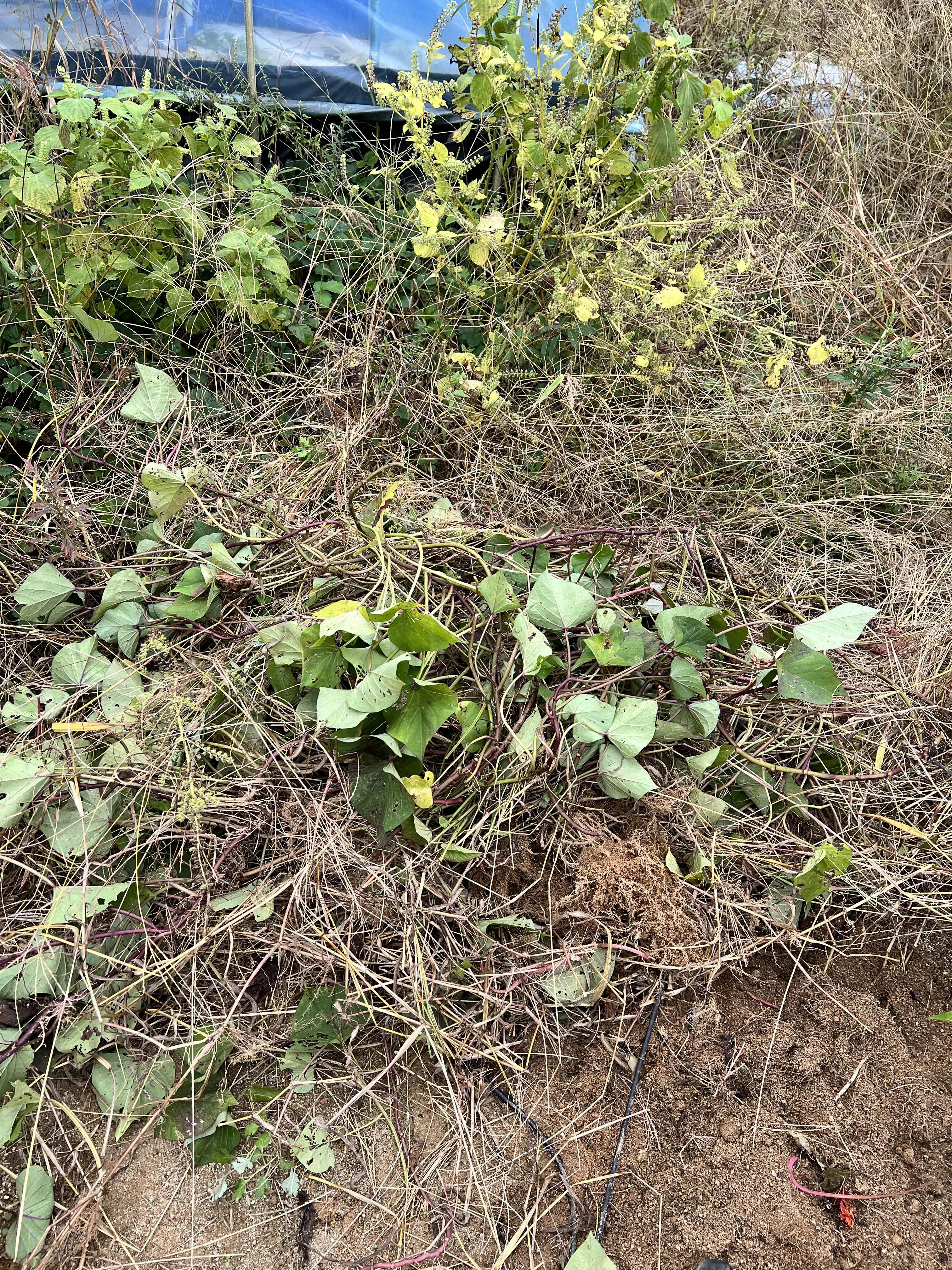 2022년도, 아니 2021년도도 엄청 큰 고구마가 부담스러웠기에 경력자이신 시어머니께 문의를 해보니 고구마순을 가찹게(가깝게) 심어야 한다고 하셨어요. 양평모종시장에서는 100주 단위로만 판단말이에요. 그래서 욕심껏 두 고랑에 가깝게 심고 남는 몇 개를 땅 끝부분에 퇴비도 없는 그곳에 심어두었지요. 오오오 이 녀석들도 잘 살아났어요!.