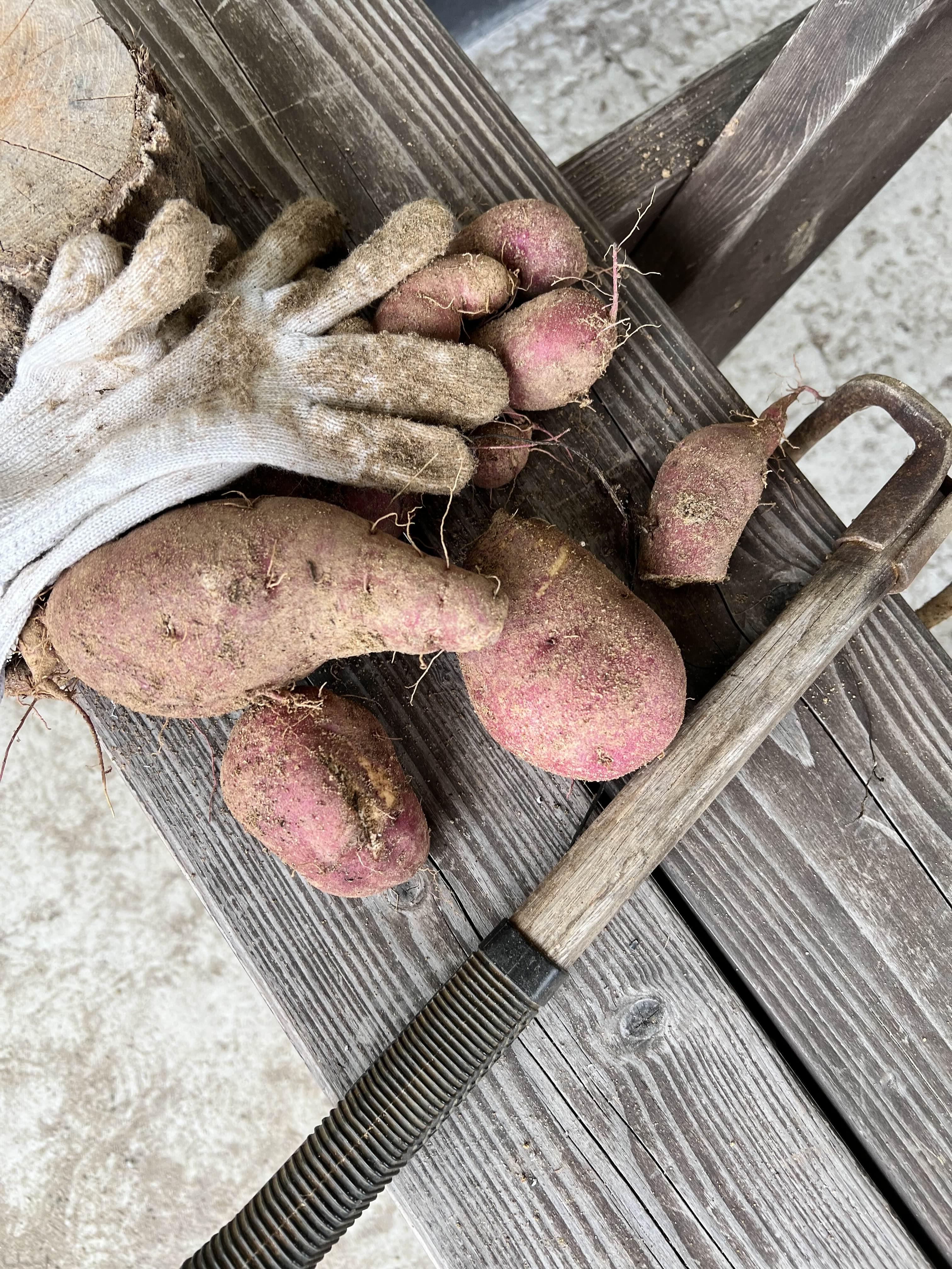 아.. 캐고보니.. 너무 가깝게 심었는지 정말 작아요. 위 사진은 그나마 큰.. 아니 제일 큰 것 ㅜㅜ) 남편은 나쁘지 않데요. 고구마 굽는 구멍에 딱 맞는다고요. 작년 건 너무 커서 못 넣었거든요. 하하...