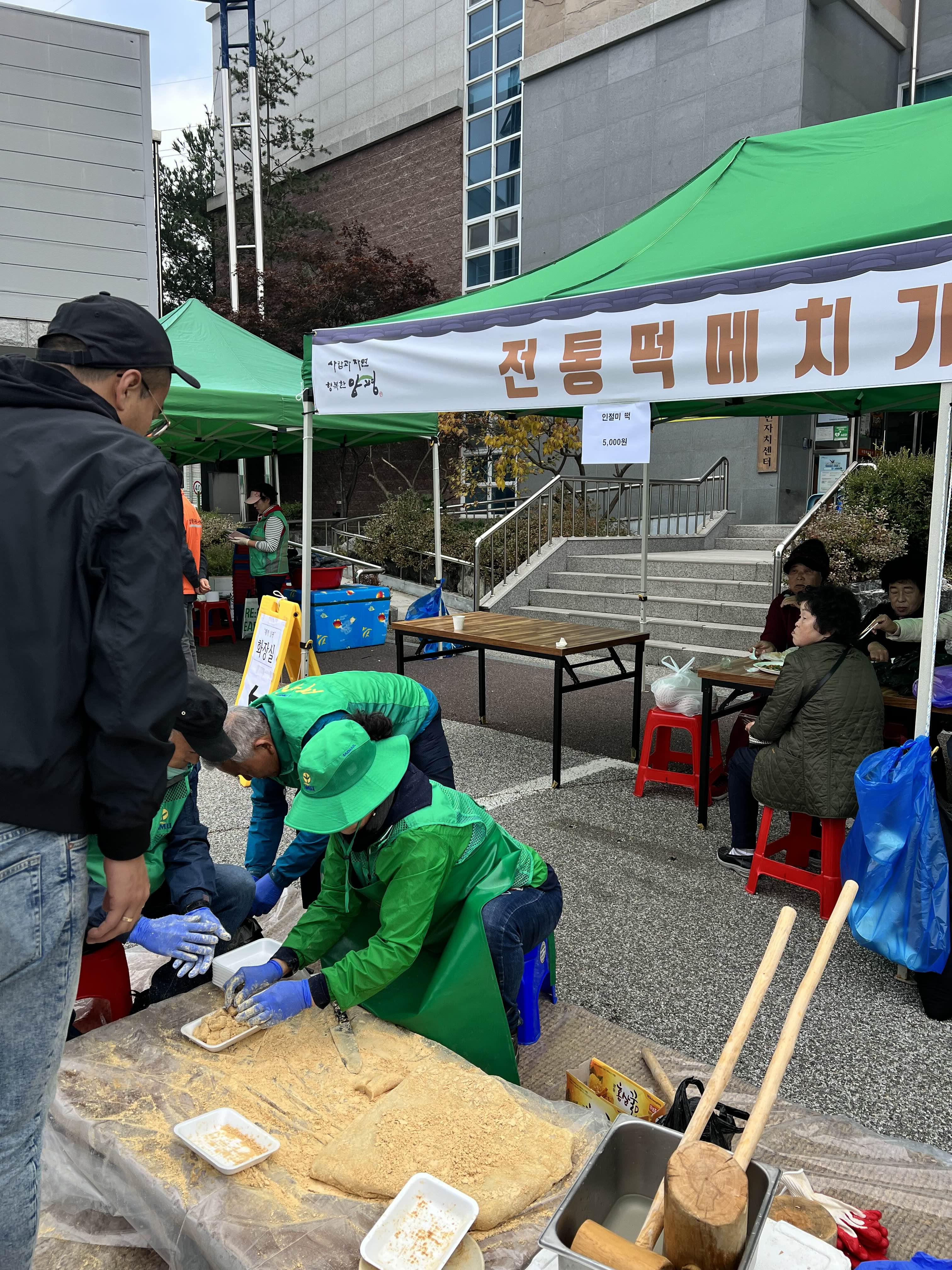 첫 행사지만 다양한 코너가 있었어요. 떡을 메친다던가 두부 시식에 판매, 그리고 빠질 수 없는 장담그기 등등이요.