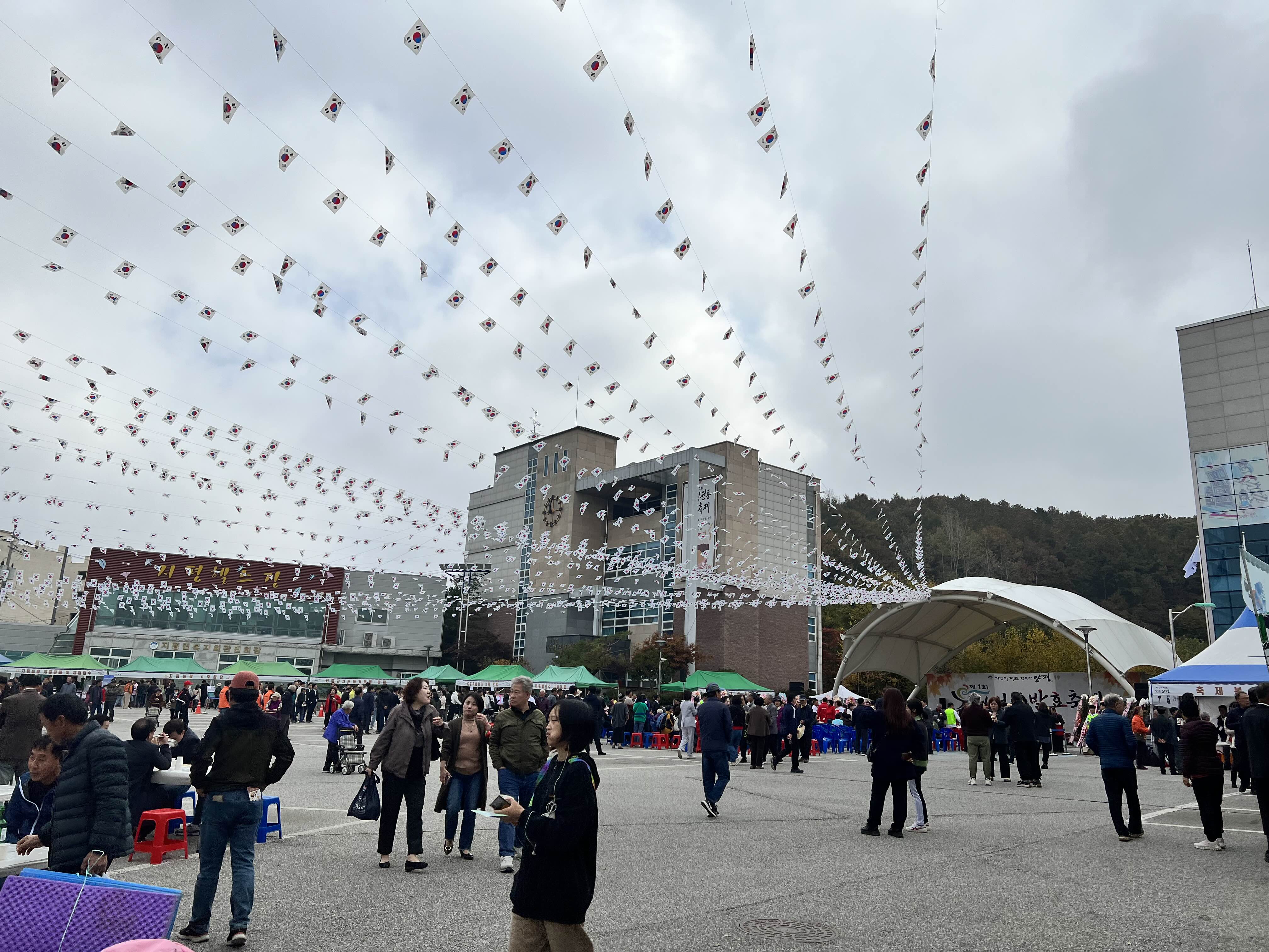주차장은 근교 초중고 운동장을 활용하고 근처 전술훈련장 부지에도 마려했더라고요. 이른 아침인니 1주차장에 할 수 있겠지 했는데, 자리가 없어서 3 주차장까지 갔어요. 지역 방범위원분들이 교통지도 등 많이 힘써주시고 계시더라고요. 태극기로 안내된 길을 따라가니 지평면사무소가 나왔어요. 이랬습니다.