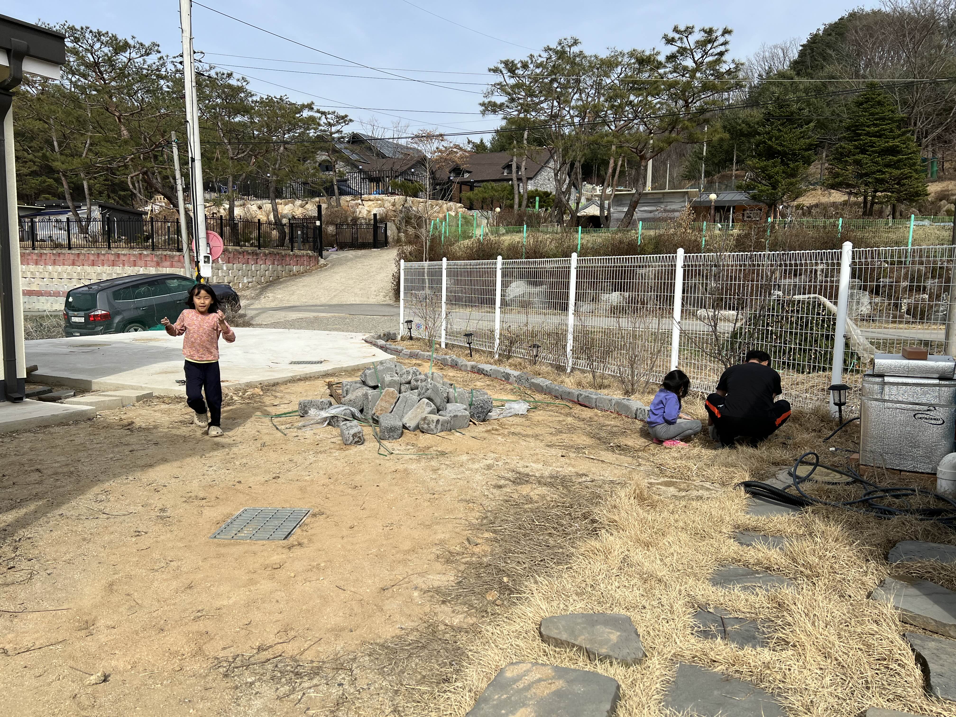애들도 같이하겠다고 저 돌을 굴려서 가져오네요. 이미 자리다 놨다고 했는데도 기어이 가져와서 기존 돌 빼고 그 자리에 자기가 가져온 돌을 놓습니다. 허허허…..