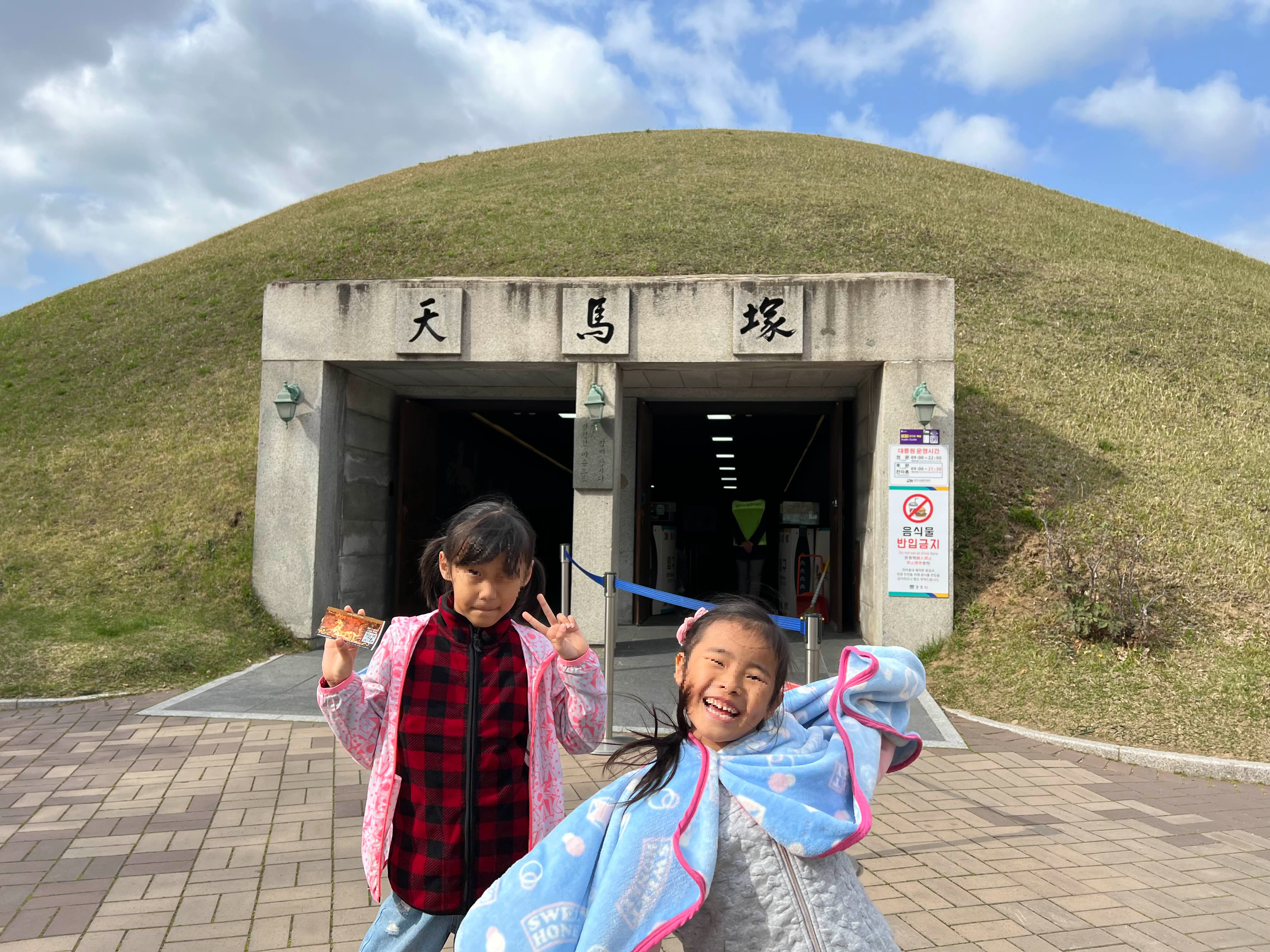 대릉원 앞에 주차를 하고 천마총을 갔다가 첨성대로 향하기로 했어요. 천마총엔 입장료가 따로 있고요. 내부도 전시관으로 잘꾸며져 있습니다. 박물관과 중복되는 내용이 많아서.... 입장료가 조금 아까웠지만, 아이가 영상자료도 꼼꼼히 보고 '남의 무덤 안'이라며 흥분하는 아이를 보니 좋더라고요. ㅎㅎ