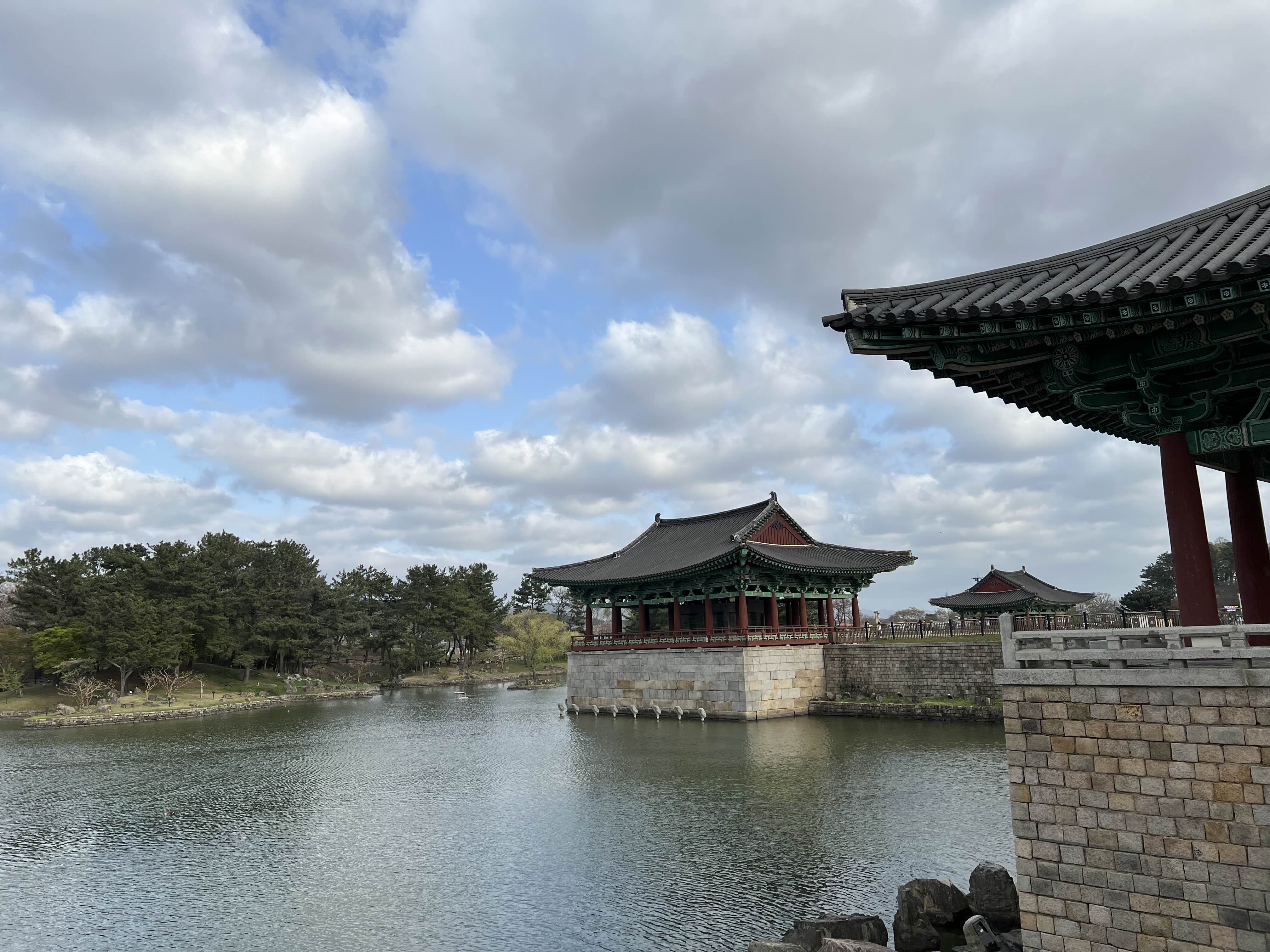원래 동궁과 월지는 밤에 와야하는데, 6시 반까지 기다릴 수가 없어서 그냥 둘러보기로 했습니다. 낮에 오는 건 처음인데, 사람도 별로 없어 산책하기는 좋더라고요. 벚꽃이 연못에 빠져 독특한 광경이었어요. 뭐.. 아무래도 야간이 아니다 보니 아름다움은 덜하지만 고즈넉한 분위기는 좋아요.