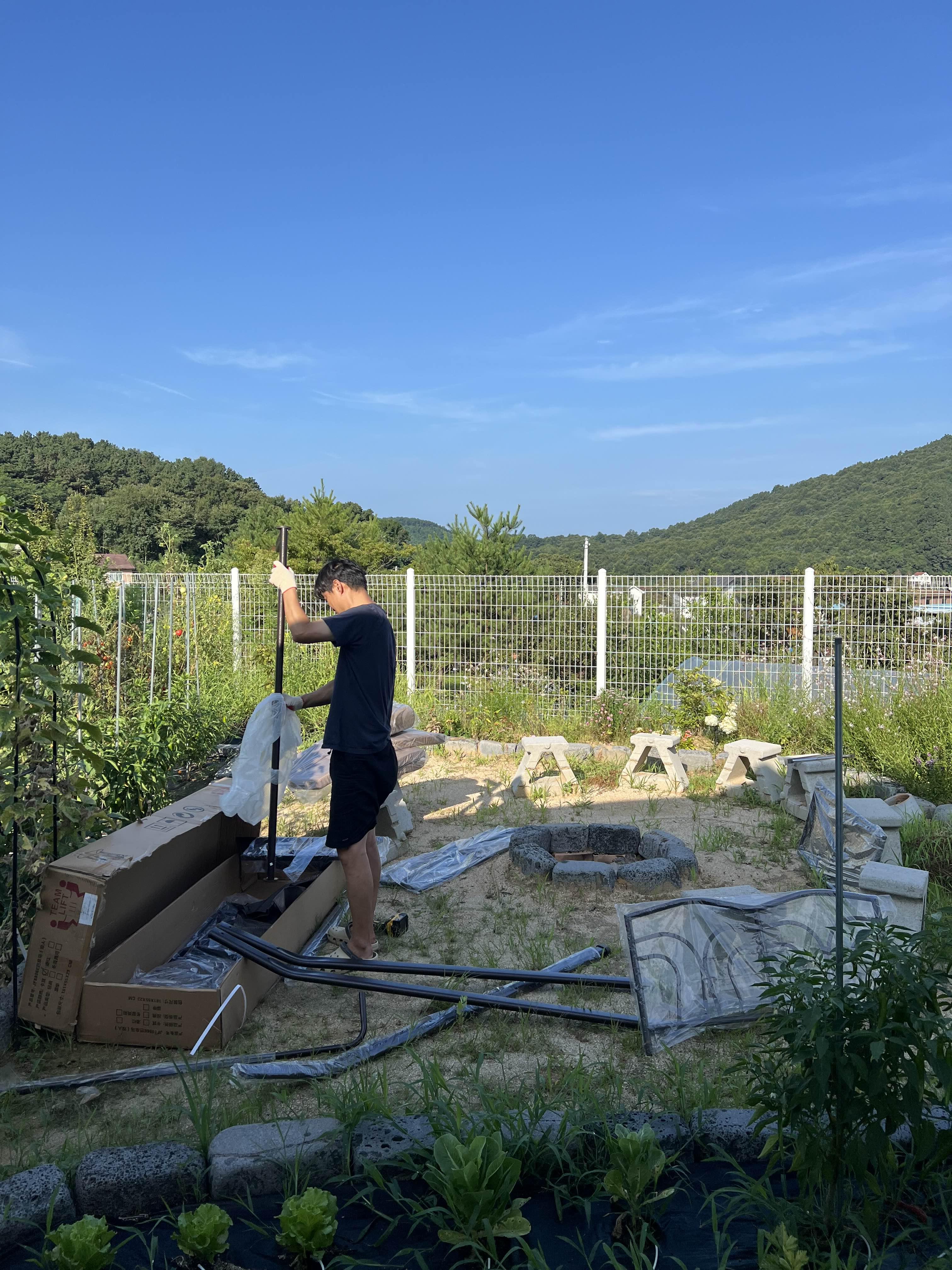 전 시원한 실내에서 있다가 완성된 기미가 보이길래 나왔어요. 쿠션 비닐 떼주는 큰 일을 하고요.