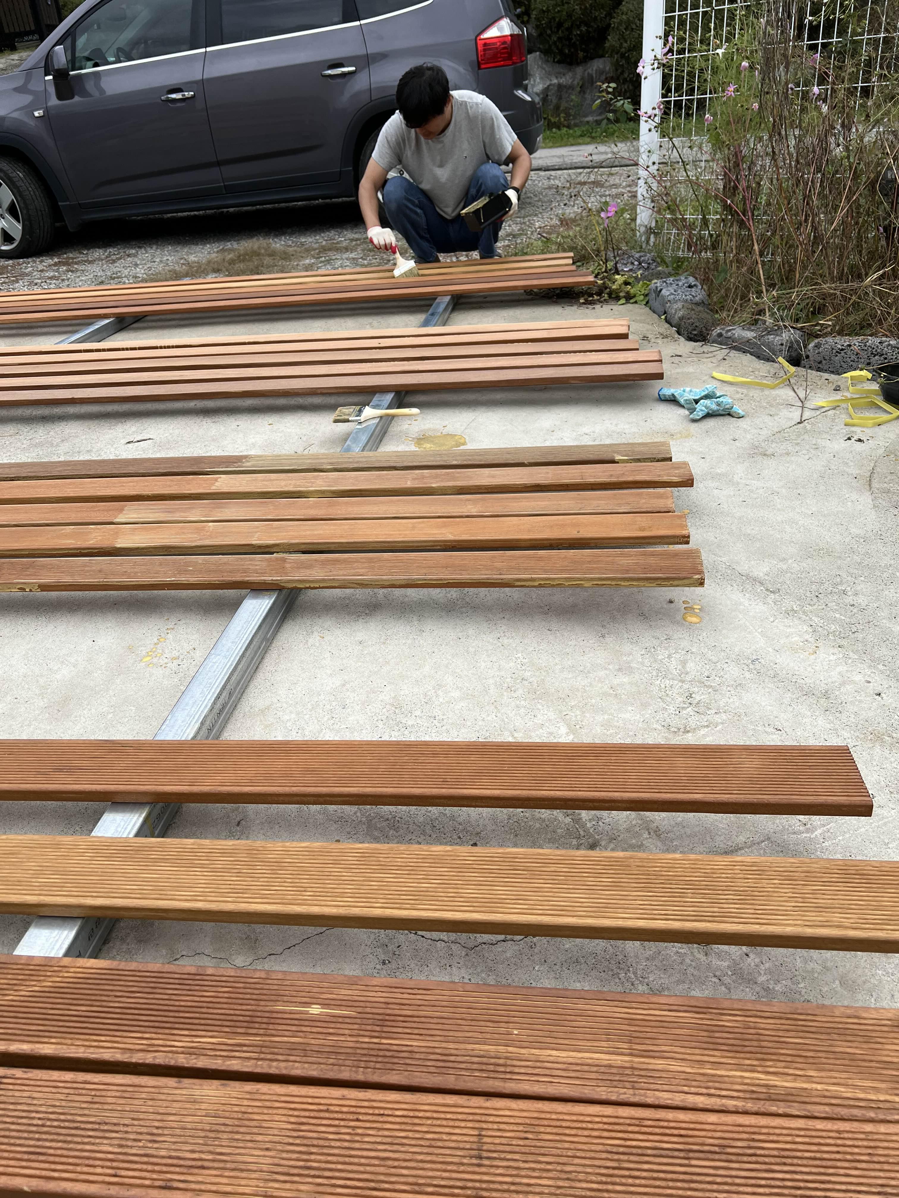 하악! 오전만 하면 될꺼라는 남편말에 시작했는데 해떨어지기 전까지 바르고 말리고 바르고~ 두번 오일스텐 발랐어요. 2일이 지난 지금까지 다리가 후덜덜~