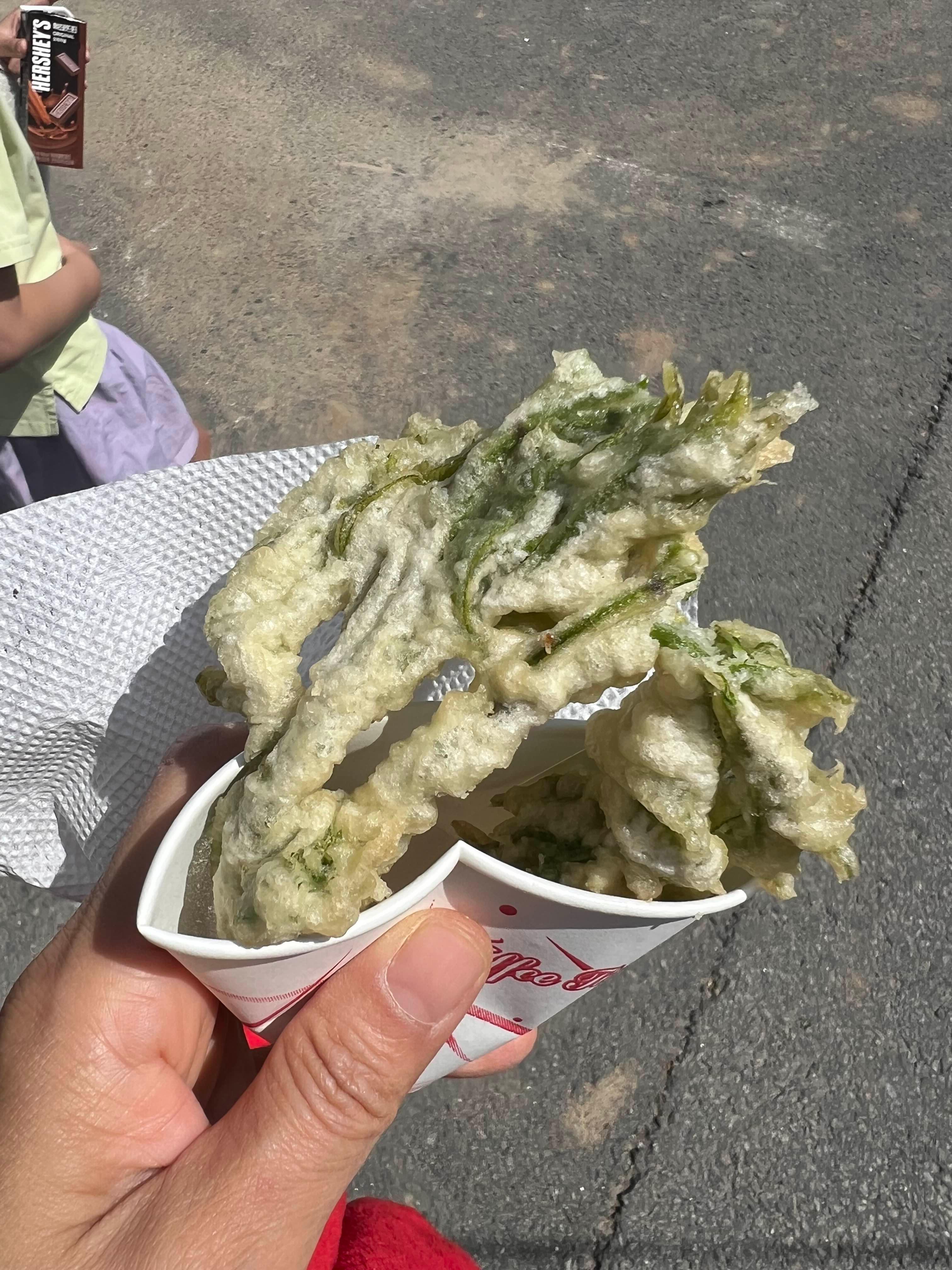 하지만~ 이렇게 두룹튀김을 팔아서 이거 하나로 대만족이였어요. 이천원이였어요. 산나물전이 만원인데 산나물 가격을 생각하면 수긍이 됩니다. 부추축제에선 3장이 만원이였어요.