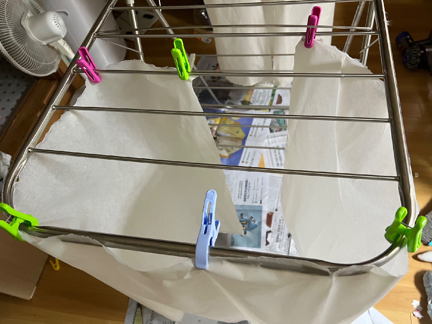 공간이 부족해서 겨우겨우 해놓고 다 마를 때 쯤보니 아래 사진처럼 안쪽으로 동글게 말아 말리면 되겠더라고요. 하아 머리가 나쁜 나요…..