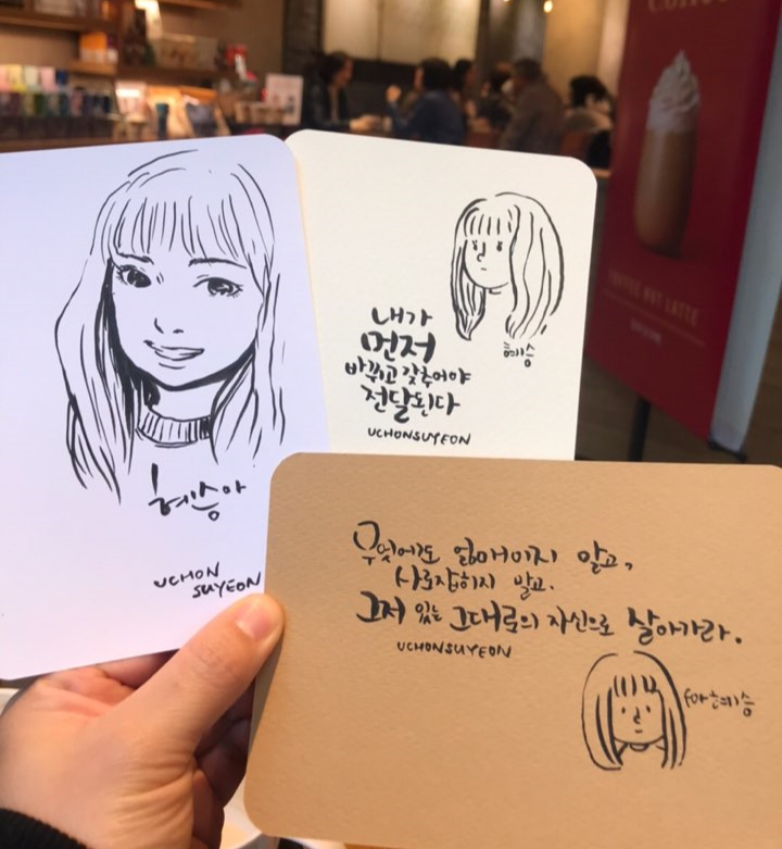 선물한답시고 글귀를 받아서 적다보면, 저마다의 생각들이나 관심사를 엿볼 수 있어서 좋다. 남의 글귀를 채집하는 기분. ㅎㅎ