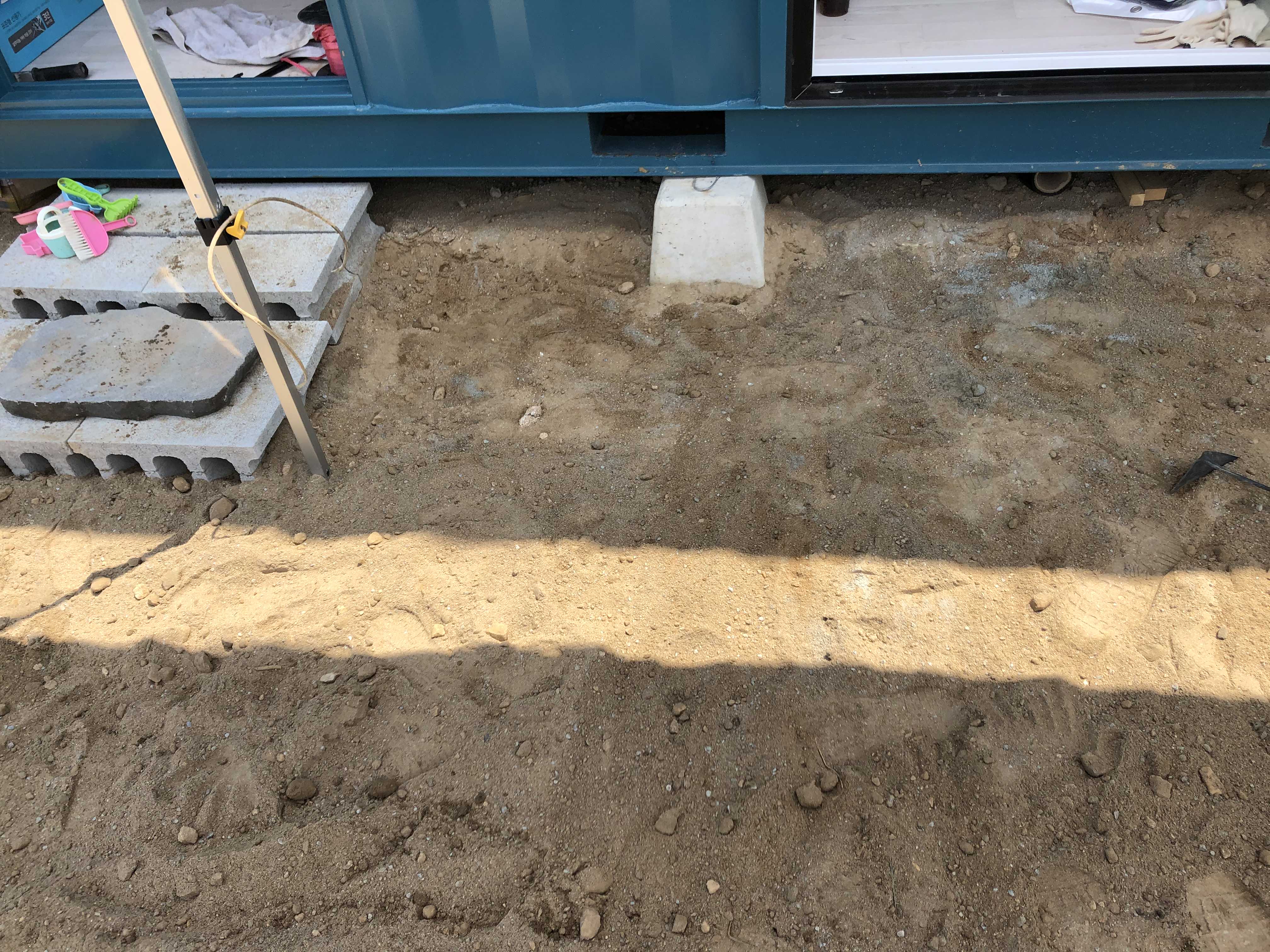 우선 쌓을 곳을 평평하게 다지고 작은 폴대를 꼽아 수평을 맞췄다. 남편이 삽으로 흙을 좀 날라주었지만, 호미로 부지런히 다듬고 손으로 수평을 만들어가며 평탄화 작업을 했다. 지난 겨울이 그닥 춥지 않아서 별의별 곤충이 넘쳐난다는데, 그 중 하나가 노래기다. 노래기가 그늘아래 숨어서 꿈틀대고 있더라. 그리고 개미집도 벌써 하나 자리를 잡았는데, 나는 무참하게 구멍을 밀어 버렸다.