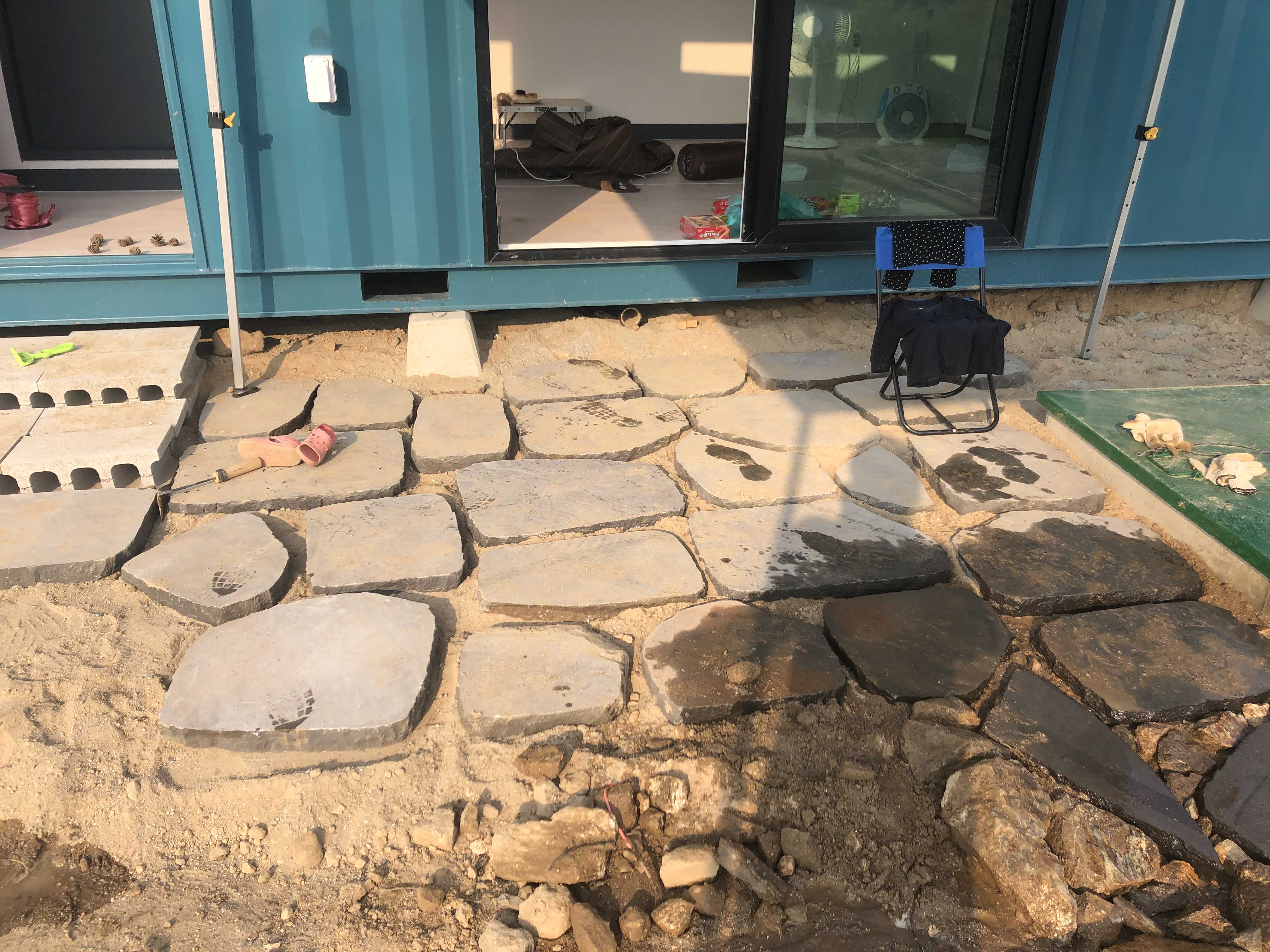 이리 평탄화 작업을 열심히 했건만 디딤석을 깔면서 다시 잡아야했다. 남편은 일주일에 4장만 깔자고 했지만, 남편이 이런 저런 일로 바쁜사이 열심히 미친듯이 깔고 깔았다. 예전 집 타일링 작업도 힘들지만 즐겁게 했는데, 나는 아무래도 타일링하는게 적성에 맞나보다. 한계를 벗어난 무게의 돌들은 허벅지와 팔에 이고지면서 가져다가 깔았는데, 나중에 보니까 다 멍이 들었더라. 누가보면 매맞는 와이프인줄 알겠다.