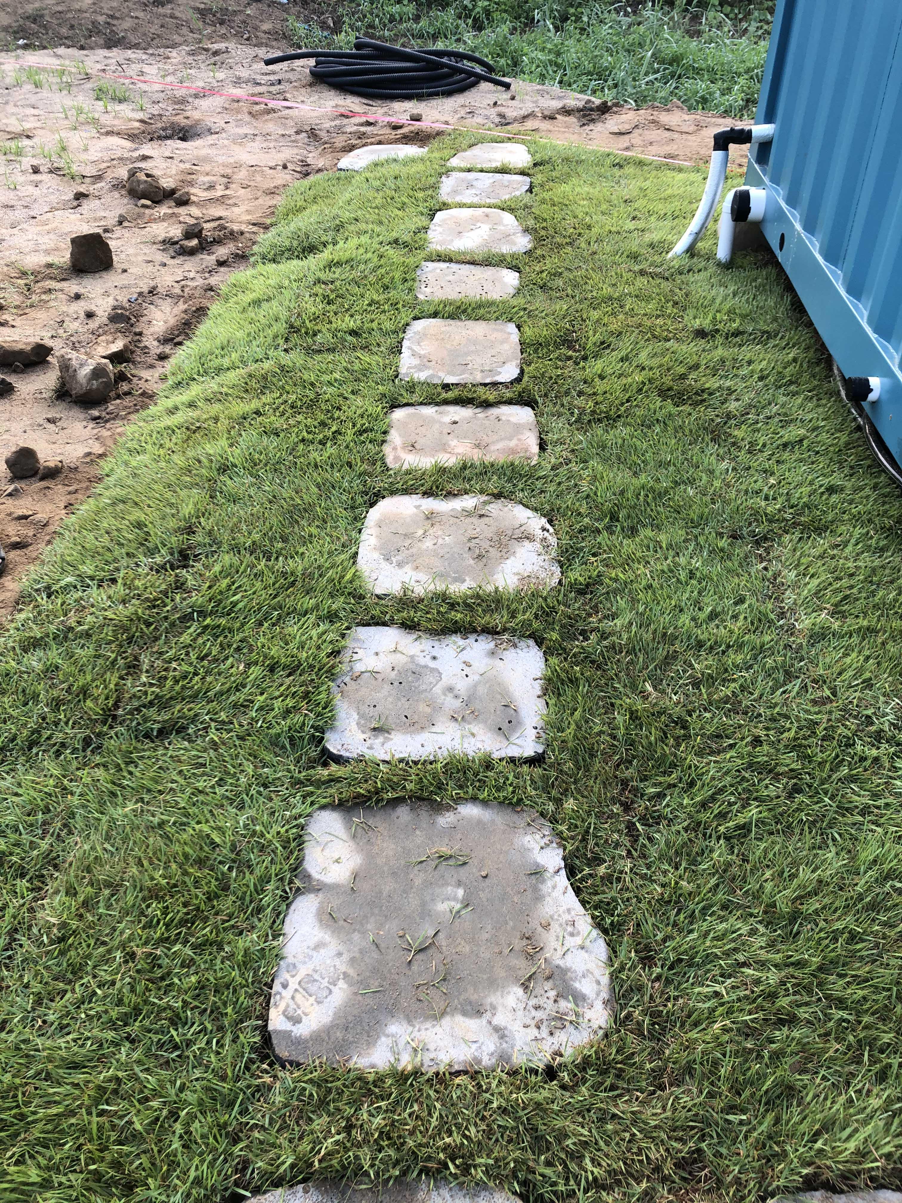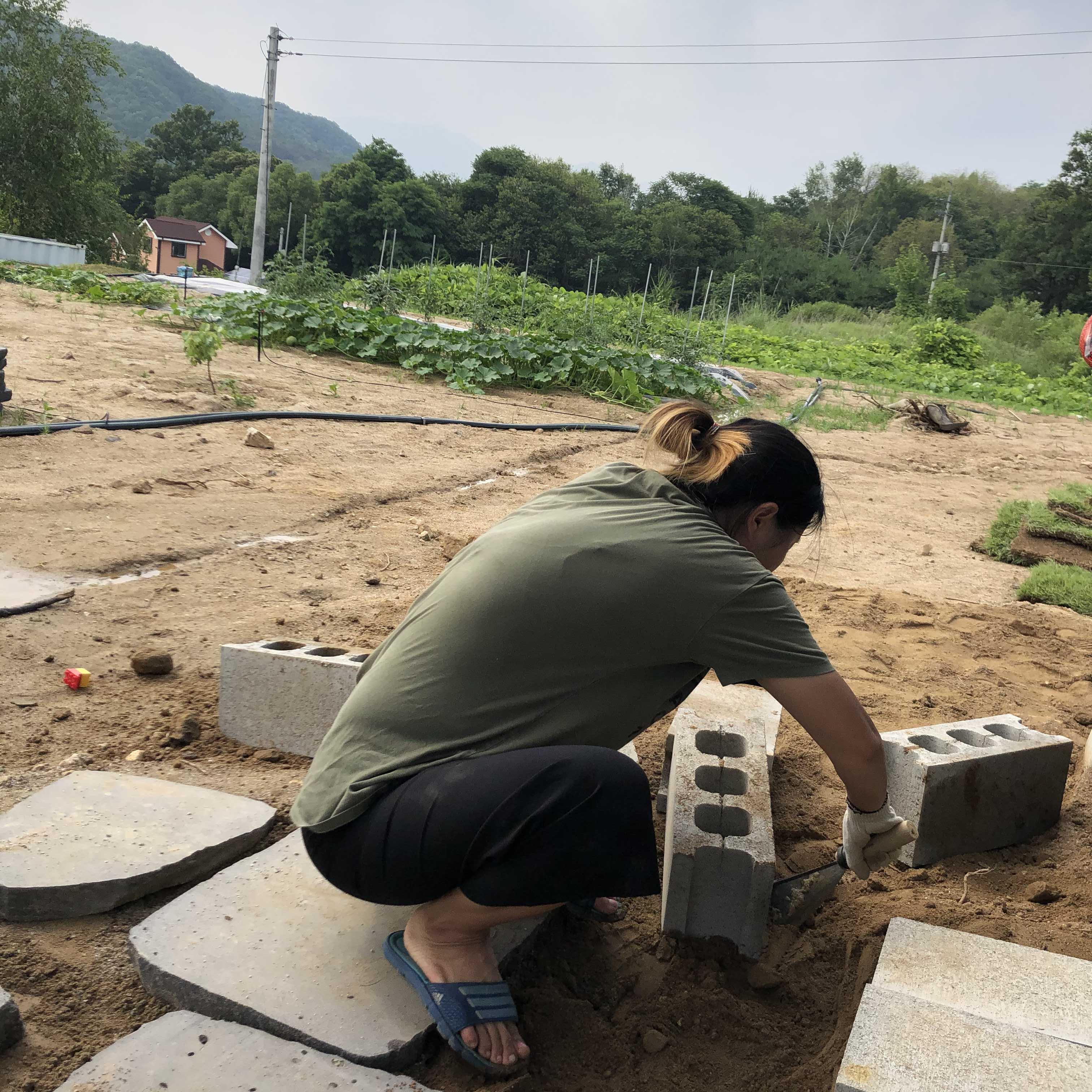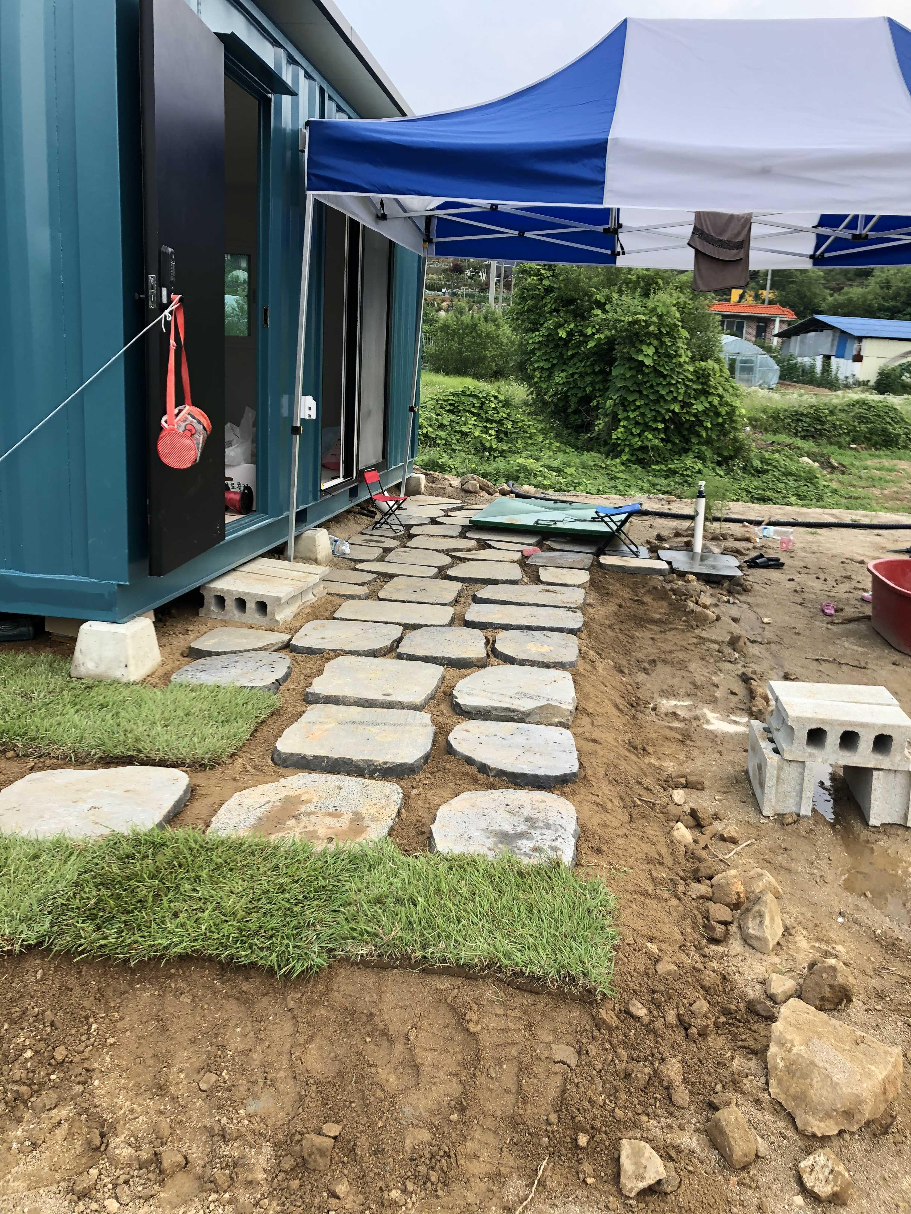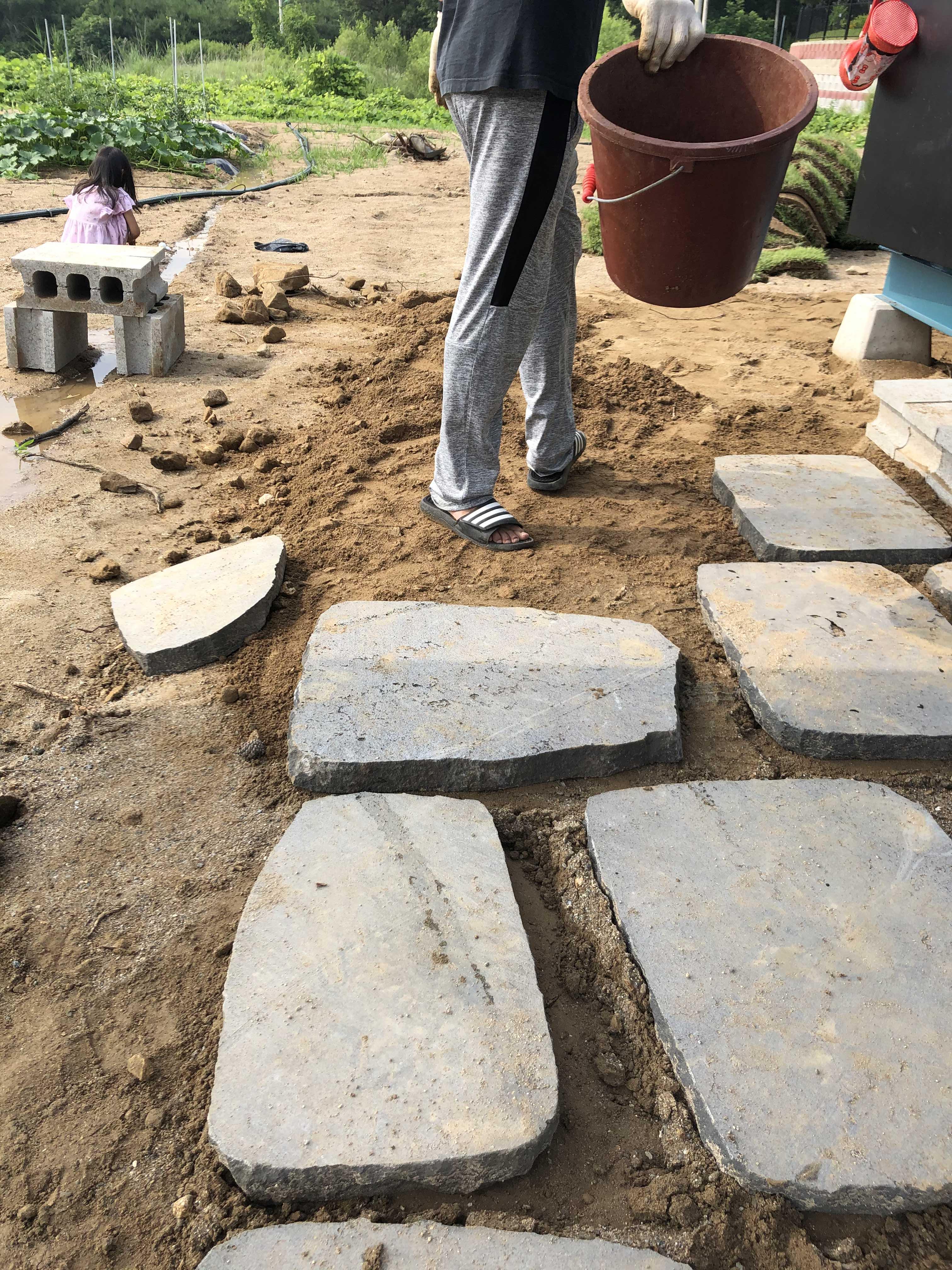 안쪽엔 나 혼자 하느라 작은 디딤석들 위주였다. 남편을 시키면서는 무거운 애들을 차근히 짜맞추듯이 정리했다. 하면서 후회한 점이, 처음에 너무 빠듯하게 디딤석을 채워넣어서 잔디 놓을 곳이 없는 거라. 그래서 다시 맞추면서 옮겼더니 평탄화 작업한 게 망했지. ㅎㅎㅎ 흔들거리는 디딤석 사이에서 나의 땀 남새가 나는 거야~~ ♪ 사실 나는 자갈을 사이에 넣고 싶었다고. 그런데 다른 영상을 봐도 자갈을 깔려면 바닥에 뭔가 한번 깔아줘야 하더라. 자갈이 흙으로 파고들어서 내려 앉는다고... 또르르.