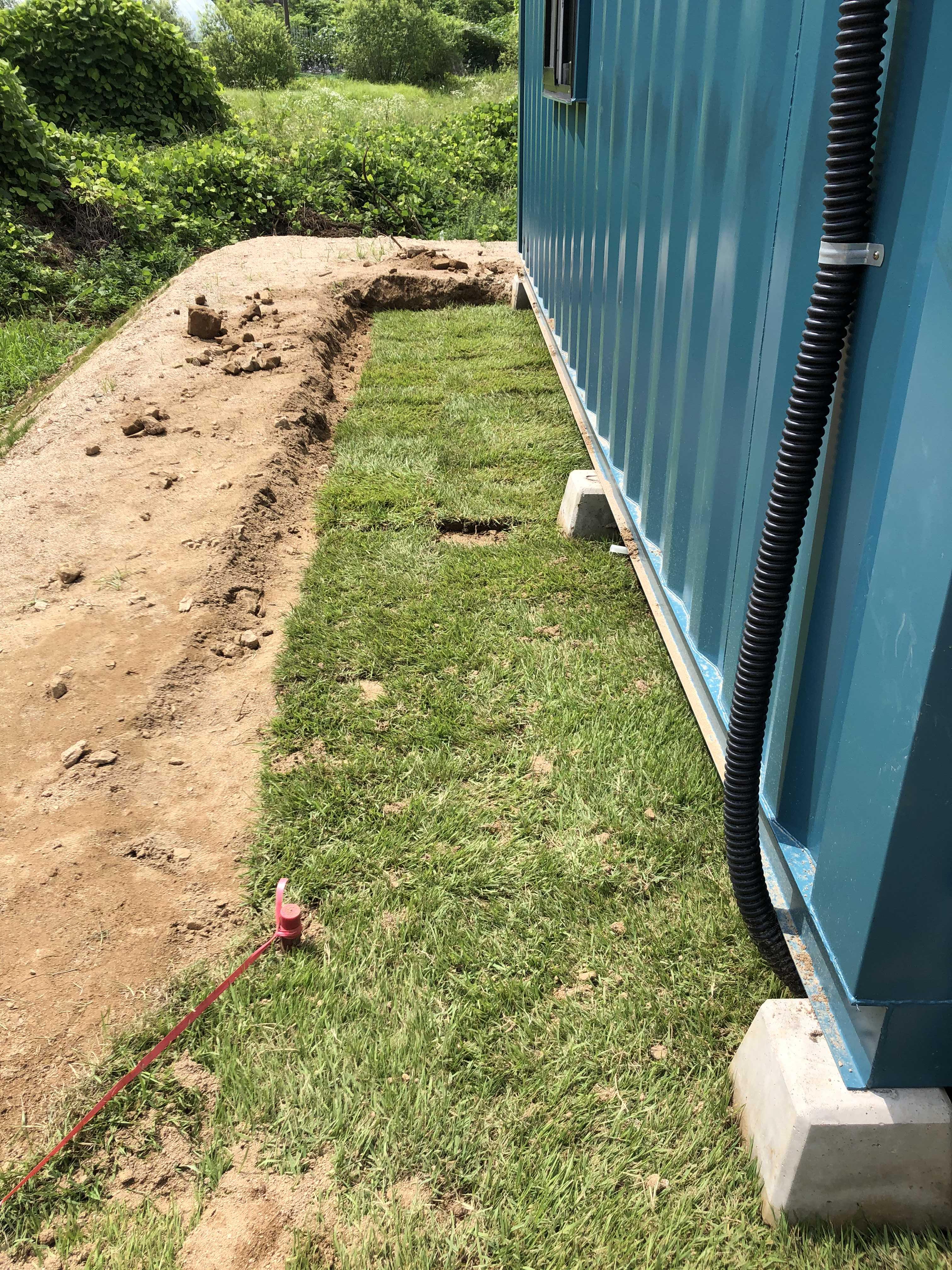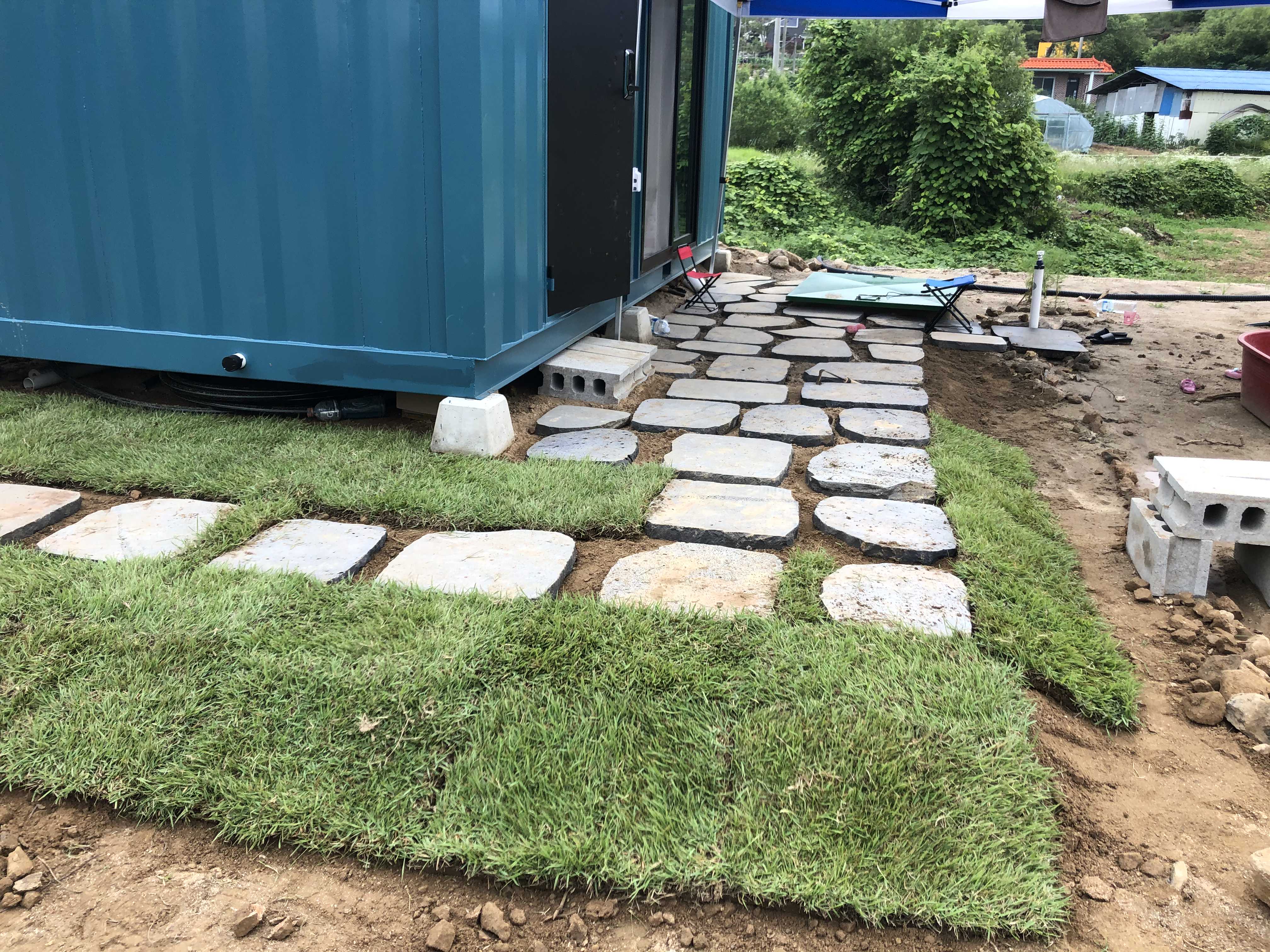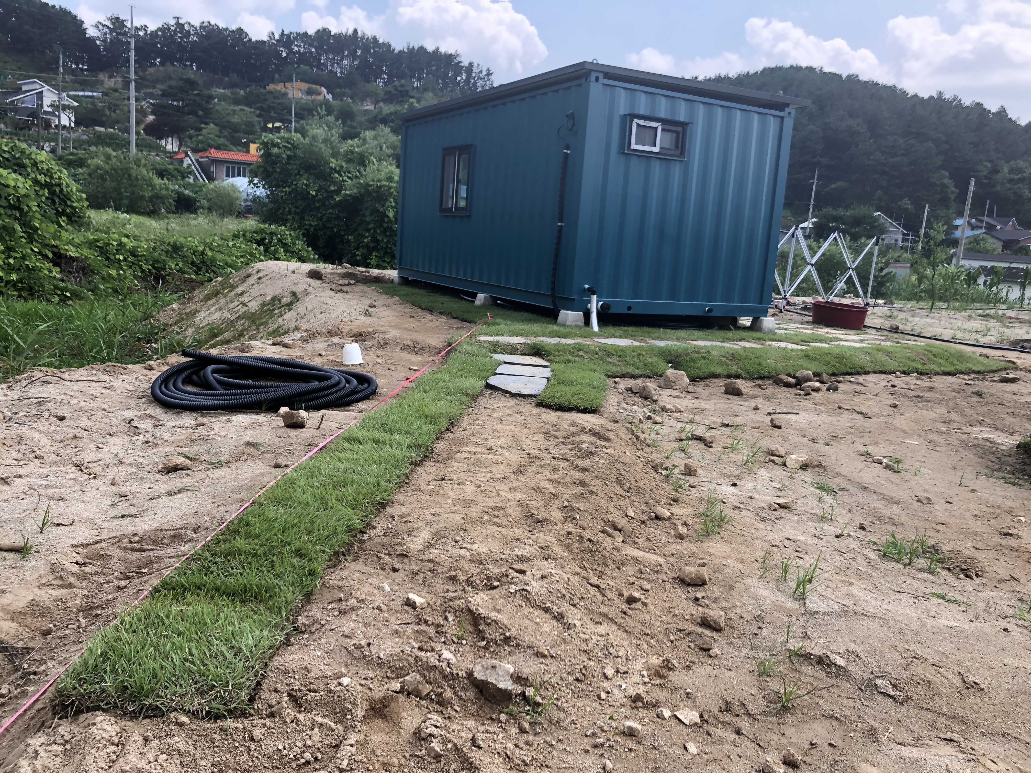 이 부분은 농막 뒷편인데, 비가 와서 농막에 흙탕물이 너무 튀었다. 높이 맞추는 겸 남편님이 삽으로 흙을 퍼내고 그 자리에 잔디를 깔았다. 날씨가 날씨인지라 새벽에 일어나 미친 듯이 삽질하는 그대 짱.