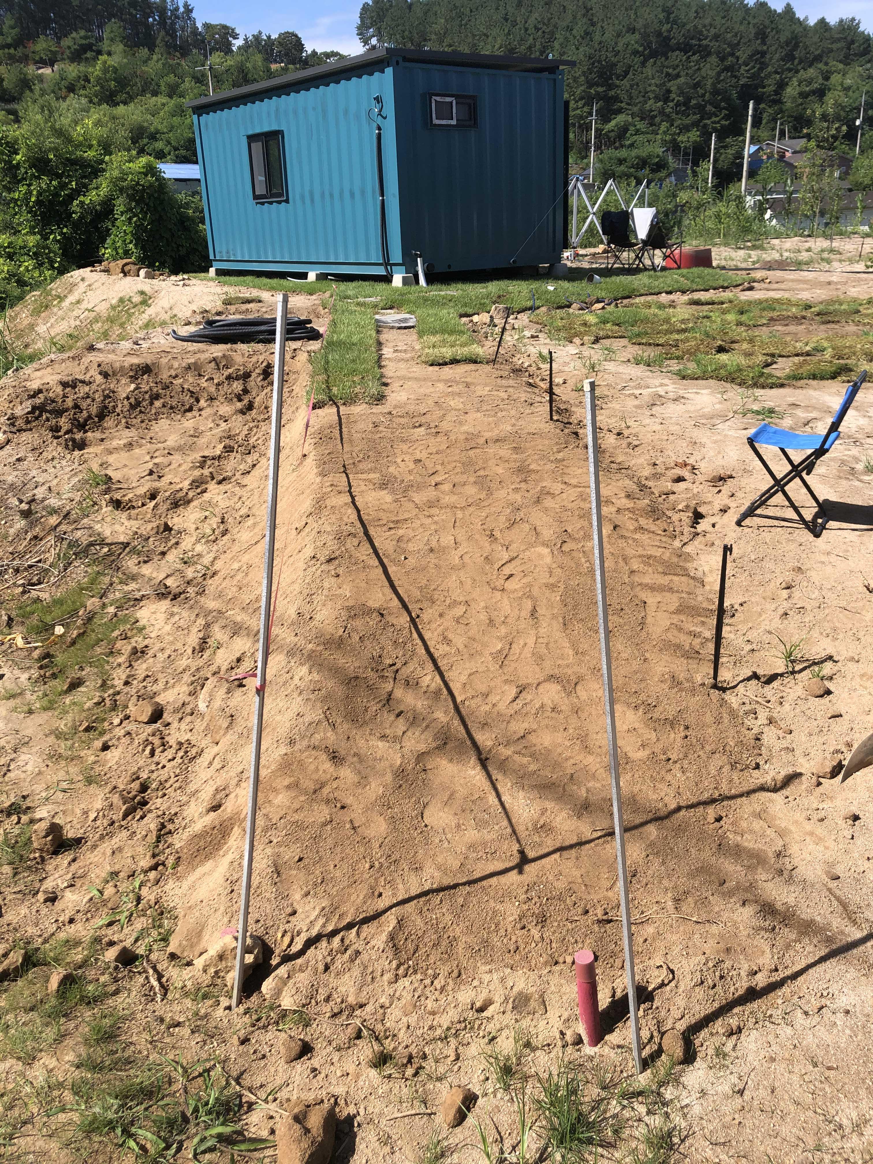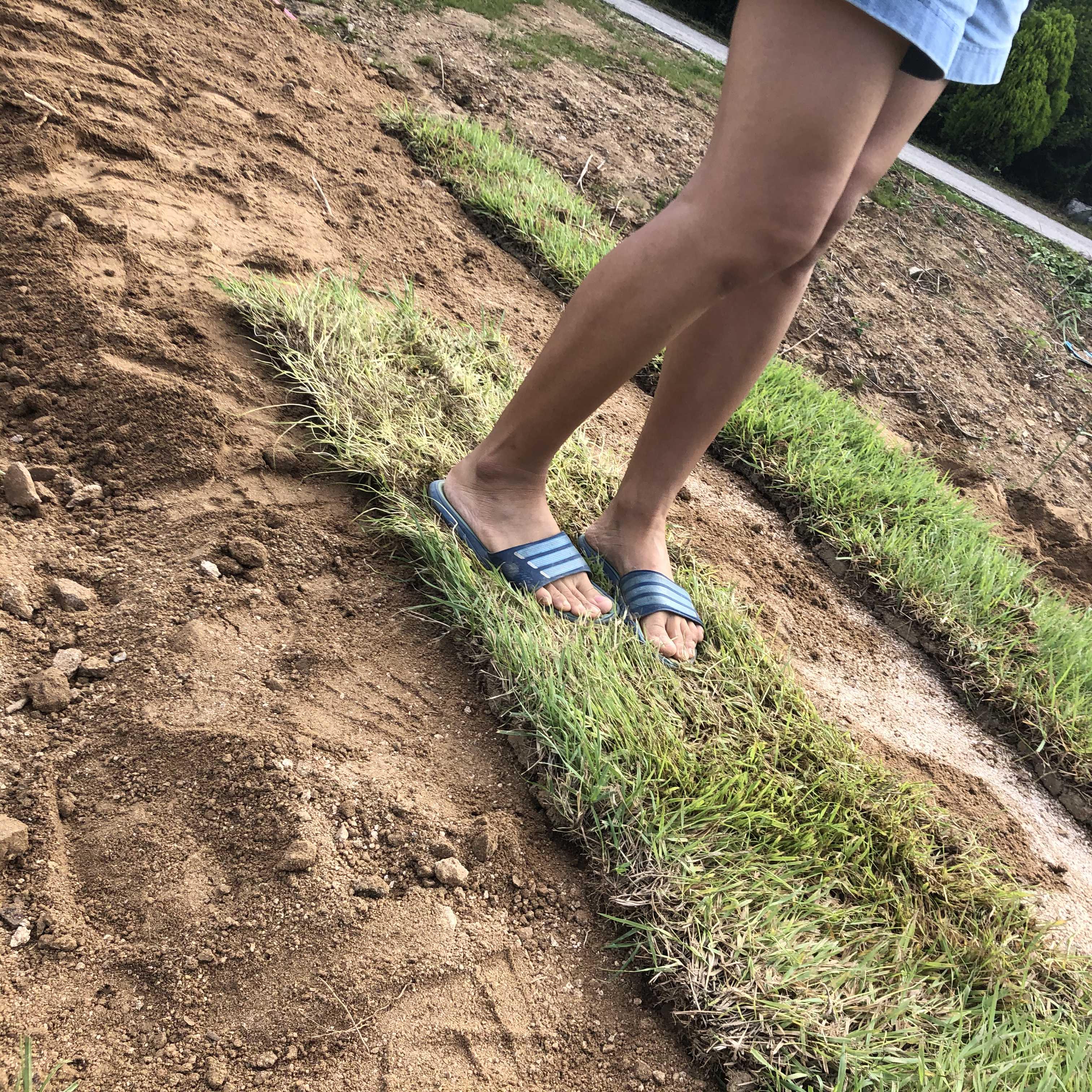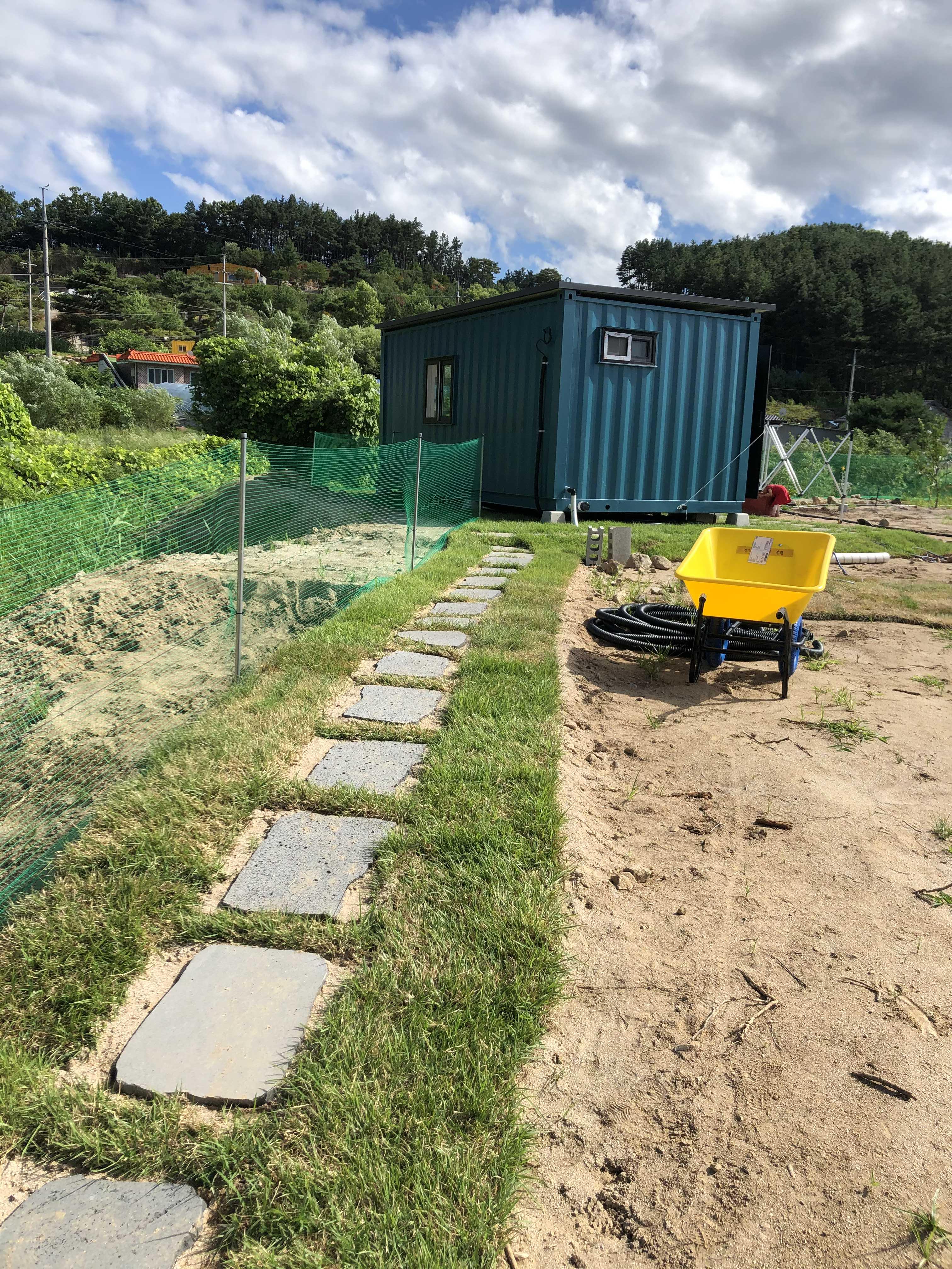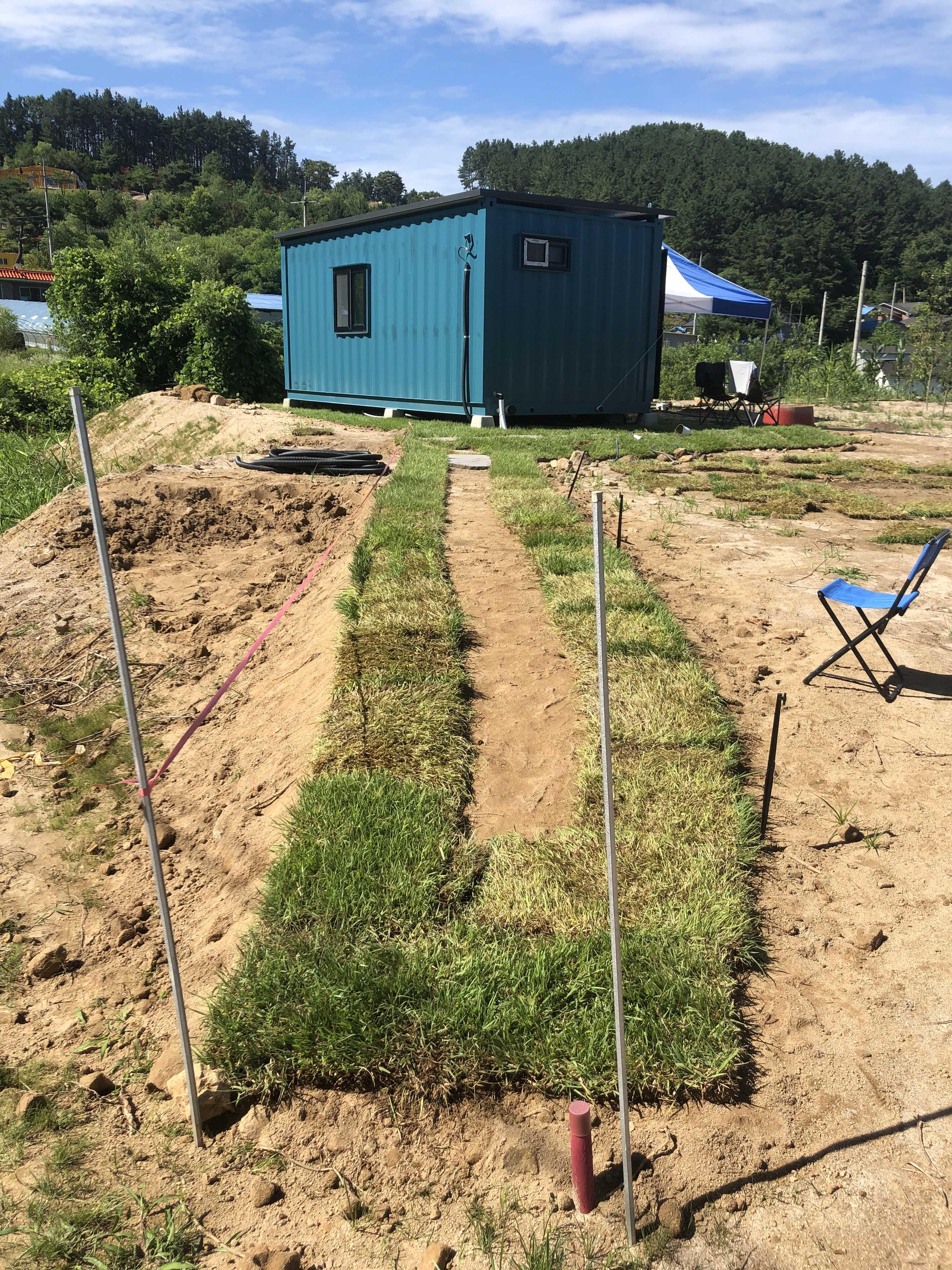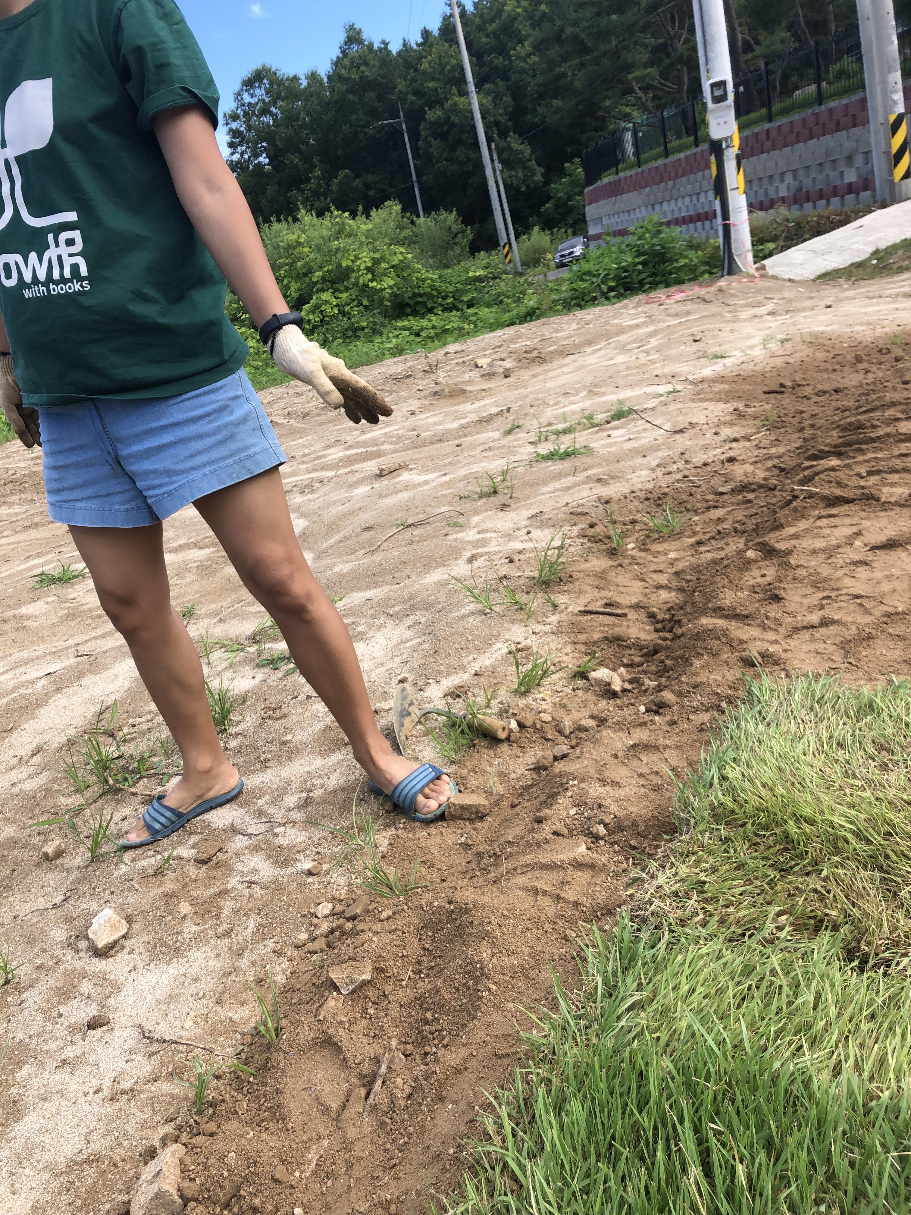 남편님은 농막 뒤쪽이 높은지라 날씨가 선선한 저녁-아침에 열심히 삽질을 해서 수평을 맞추었다. 들어와서 쉬라 고해도 시원한 바람이 불 때 해야 한다고 열심히 삽질을 하더라. 남편의 일이 끝난 즈음 일어나 나의 작업분을 하러 나갔다. 삽질이 필요했는데, 남편은 할 일을 다 끝냈다며 자기는 구경하겠단다. 흙을 퍼내고 맞춰 올려둔 잔디에 물을 뿌리며 나의 삽질을 구경하더라.