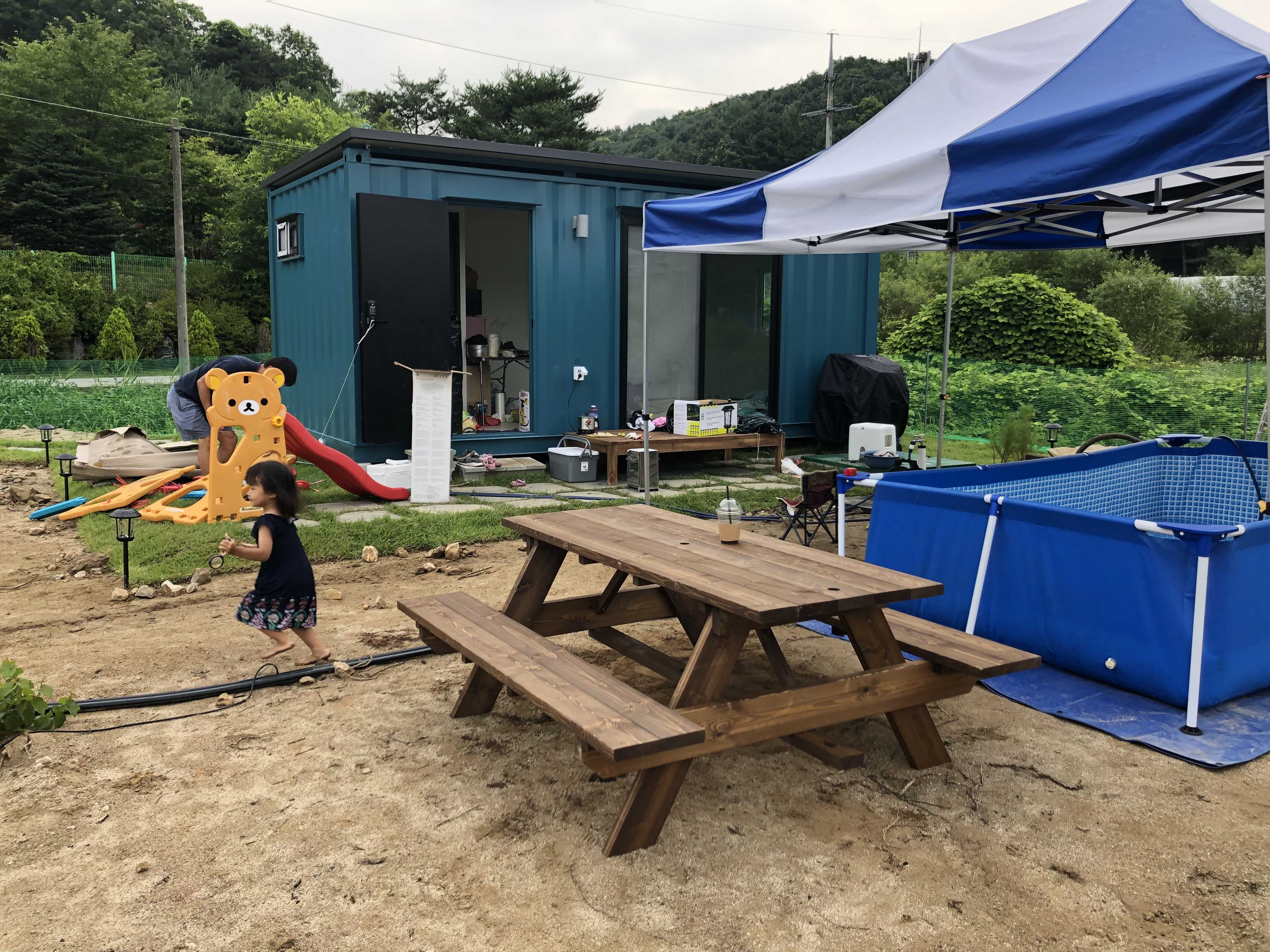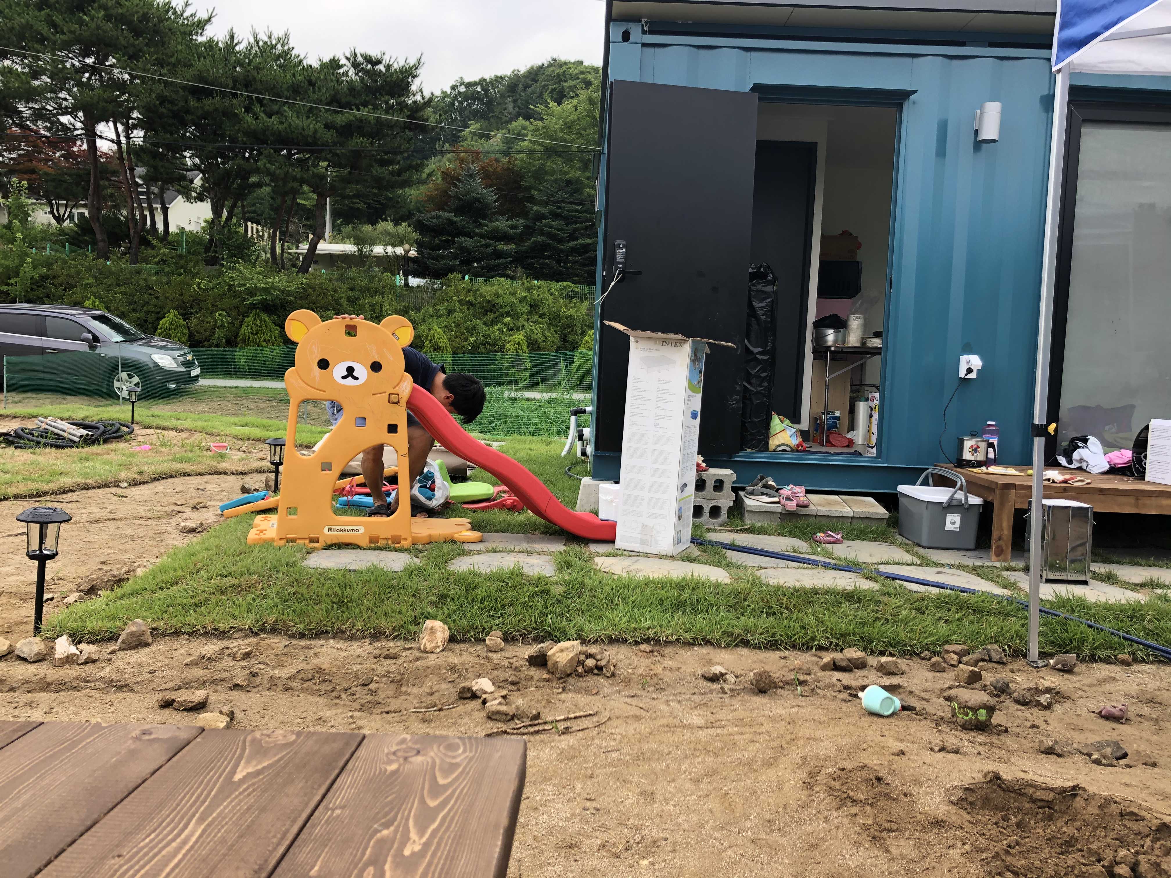 여름마다 옥상에 설치해두던 몰놀이장을 양평으로 가져왔다. 더불어 주문해두었던 야외용 테이블도 도착해서 남편은 이른 아침부터 분주하다. 아, 그리고 거실을 한가득 차지해서 괴롭히던 리락쿠마 미끄럼틀+그네 세트로 데려왔기 때문에, 시원한 이른 아침이었건만 남편은 땀을 뻘뻘 흘리며 수고스럽게 열 일했다.