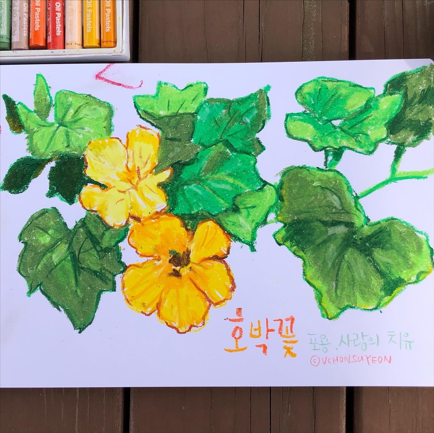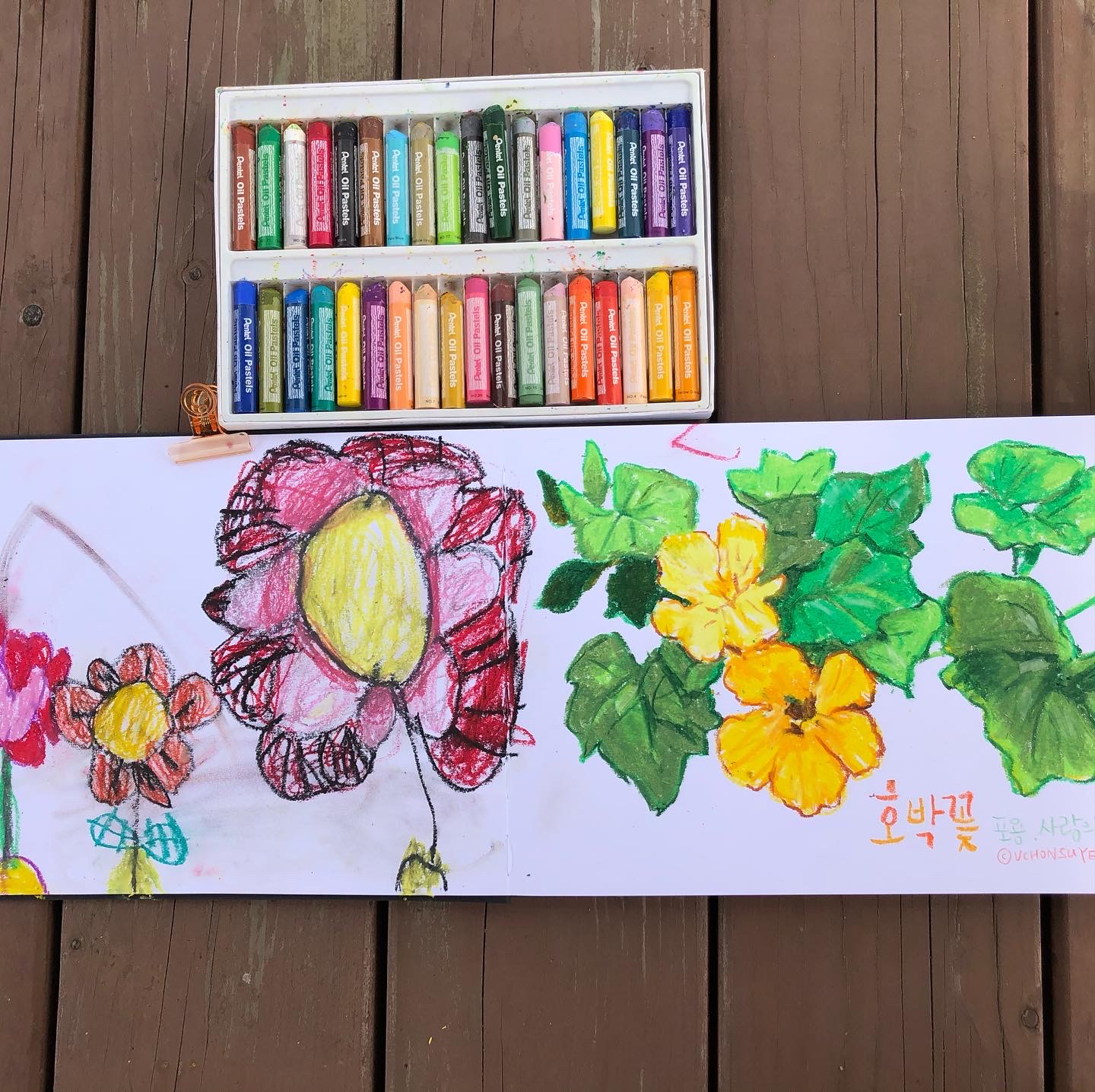 우리밭에 호박꽃이 예쁘게 피어서 그림을 그렸어요. 두번째 사진 왼쪽은 시원이 그림. 놀이터에 놀라고 두고 그림 그리려고 했더니 옆페이지에 그리더라구요. 오일파스텔이라 겹쳐져서 호박꽃 그림은 망. ㅎㅎㅎ