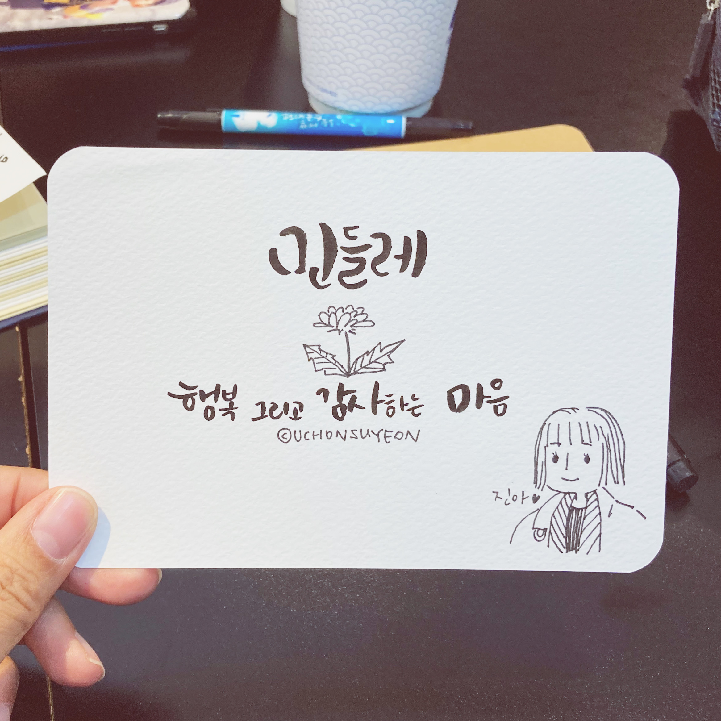 오랜만에 만나는 지인들에게 선물로. 선물로 그리고 쓰는 와중에 잘한다는 격찬에 몸둘바를 모르겠더라. 뭐라도 배워두고 작은 거라도 선물하면 받는 기쁨이 배는 되네.