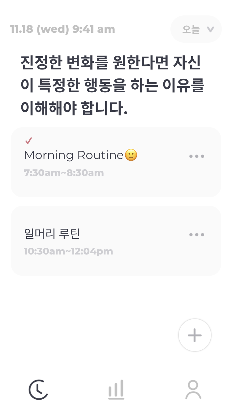 앱 소개하는 코너에서 루티너리라는 앱을 발견했다. 인기가 상당히 좋은 고로 나도 깔아보았다. 조금 들여다보니 쫀쫀하게 시간을 쓰는 방식의 앱이다. 아침에 물 마시기 1분 -> 침대 정리하기 10분 이런 형식의 앱이다. 여러 개를 하나의 루틴으로 담고 보니 과연 할 수 있을지 의문이다. 앞서 얘기한 대로 다이어리에 빼곡히 적어서 실천해본 적이 있는데, 적고 해야 한다는 그 과정도 그 과정을 짜고 생각하는 과정 또한 매우 피곤하게 느껴졌었다. 그래서 일단 루틴을 하나 만들어 놓기만 하고 무시했다.