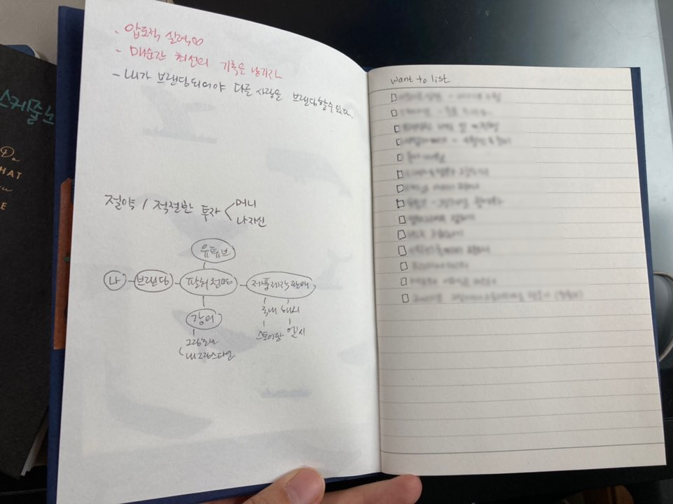다이어리에 적으니 반복적으로 적는 것도 귀찮고, 다이어리가 지저분해지는 감이 있어서 따로 뺐다. 분산 노트를 정식으로 시도해보는 것이다. 그리고 중요한 게 가벼워야 한다. 노트 아니 수첩 형식으로 한 것도 그래서다. 노트 여러 개 써봤는데, 나는 자꾸 하나를 빠뜨리거나 쓰다 말기를 반복했다. 예전에 만화를 취미로 그렸고 스토리든 그림이든 아이디어를 적는 걸 의무적으로 거의 20년 써봤다. 그중에서 끝까지 잘 쓰는 건 '수첩'이었다. 이런 가벼운 수첩 여러 개를 돌려 쓰는 게 나에게 적합했다. 잘 써나갈 것 같은 예감이 팍팍 든다. 연말에 리뷰를 하리라. 후훗