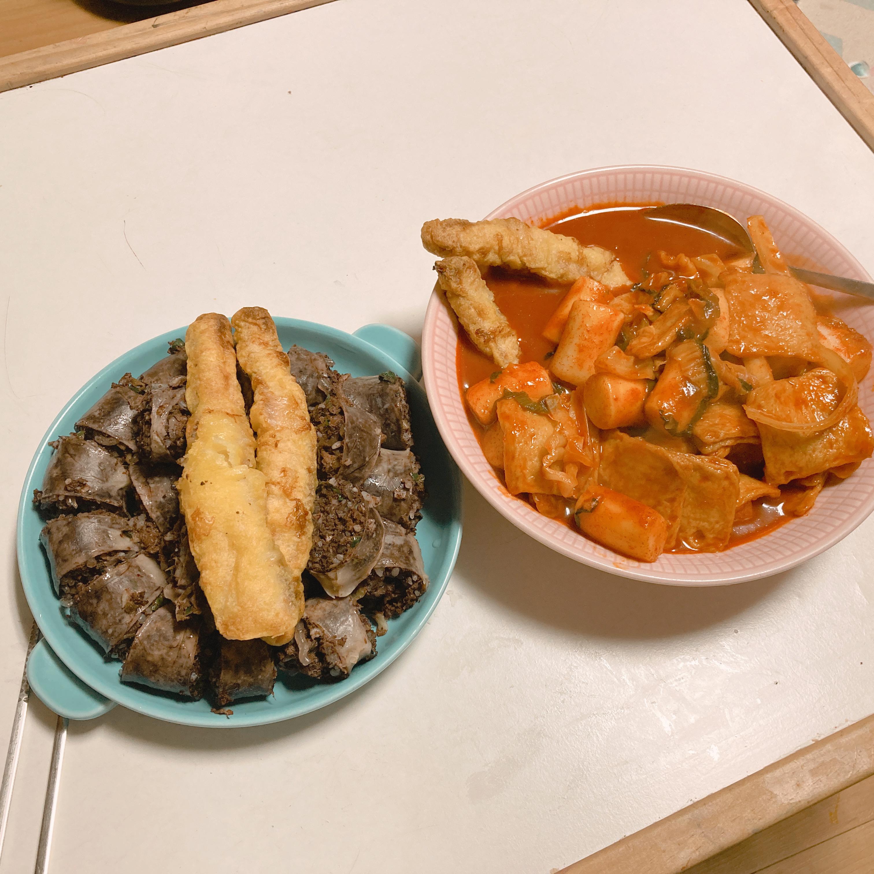원래는 양평 가서 해 먹을 거라 급하게 마켓걸리에서 진전 통 순대, 금미옥 쌀 떡볶이를 시켰다. 홈플러스 시그니처 오징어튀김이 있어서 그건 남은 거 먹기로 하고.