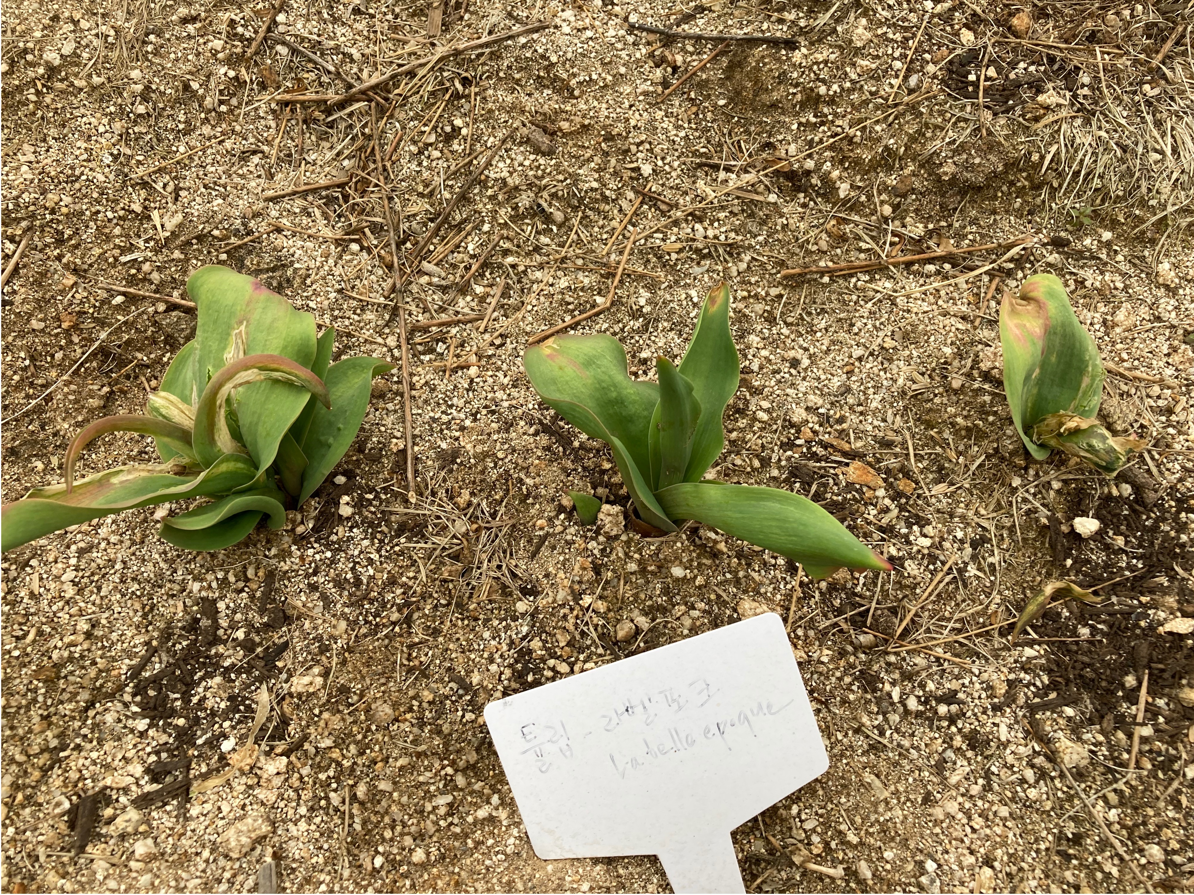 우리농장 미니꽃밭은 삼각형으로 된 입구에 있는 것과 농막 앞쪽 길게 있는 꽃밭 두가지가 있는데, 입구 부분 삼각형 꽃밭에는 튤립을 많이 심어뒀다. 오며가며 보는 사람들도 즐거우라고. 꽃이 예쁘게 피어오르라며 쓰다듬어주고 예뻐해줬는데,... 아래 두 사진만큼 컷는데...