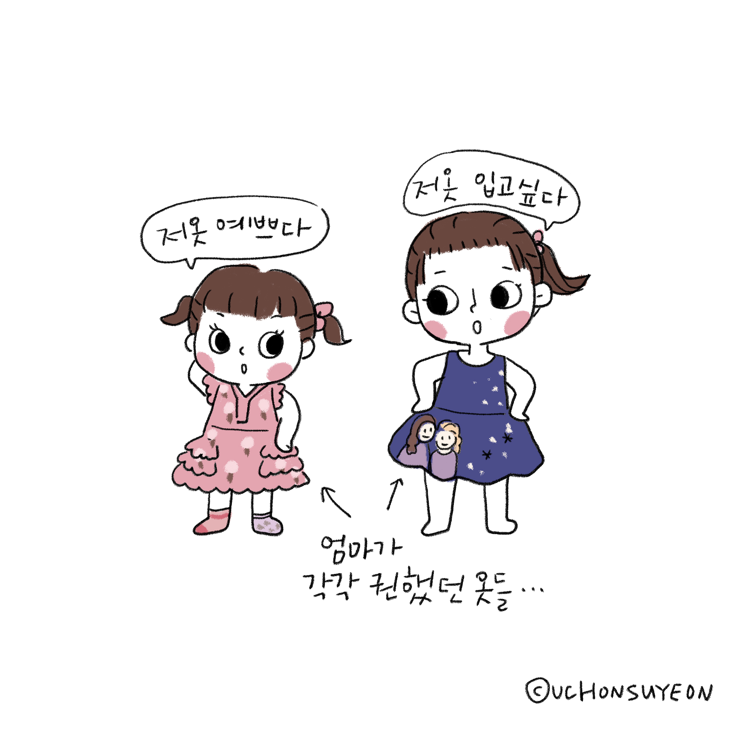 자매들은 그래요. 서로 사랑하면서도 질투하고 시기하지요. 각자 원하는 옷을 입혀놨더니 서로의 옷이 마음에 든다고 하더라고요. 허허. 그전에 분명히 물어볼 때는 싫다고 했던 옷인데 말이에요. 결국 둘이 바뀌 입고 등원했어요. 음. 그래도 한쪽만 바꾸고 싶다고 징징대는 것보다는 훨씬 낫긴 하지요. ㅎㅎ