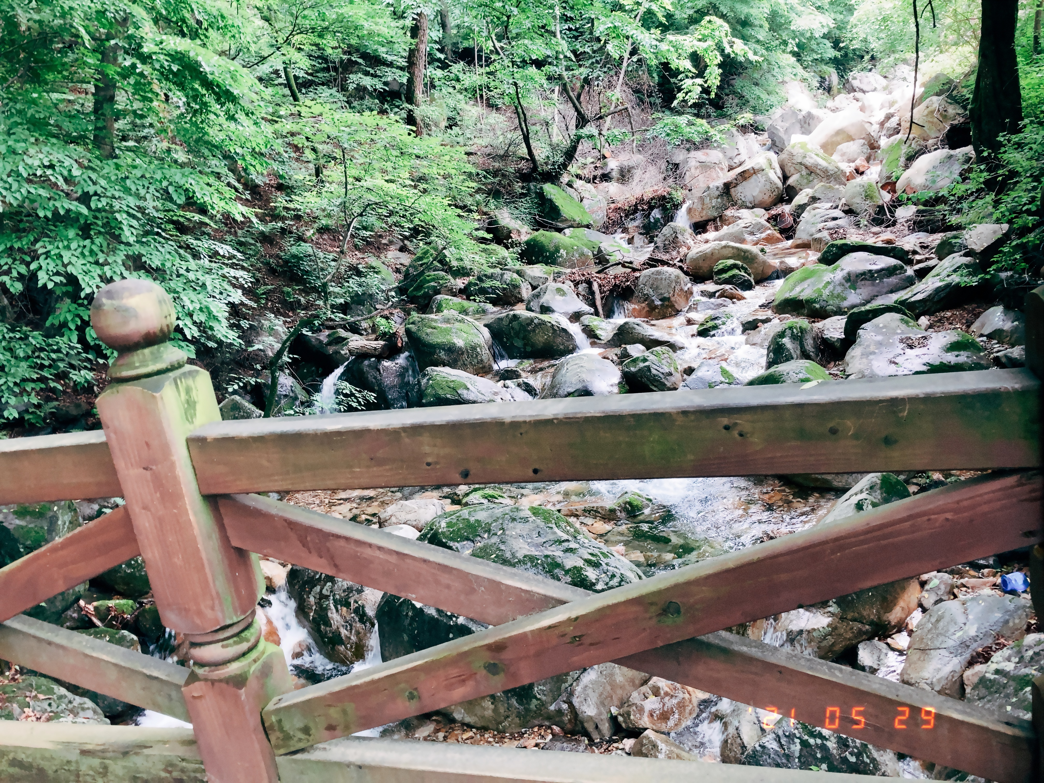 지난 방문엔 눈도 오고해서 옆길에 흐르는 물을 제대로 볼 수 없었다. 물이 쓰나미처럼 꿀렁거리며 내려오는 모습에 아이들이 두 눈을 반짝이며 잘 따라 올라갔다. 비가 온 후라 내려오는 물 양도 많고 맑고 산뜻했다. 관리가 잘되어 있어서 쓰레기 하나 없다. 잘 닦여인 길과 옆에 흙돌 길이 공존하는데, 편리함과 자연이 주는 혜택을 동시에 받을 수 있는 곳이다.