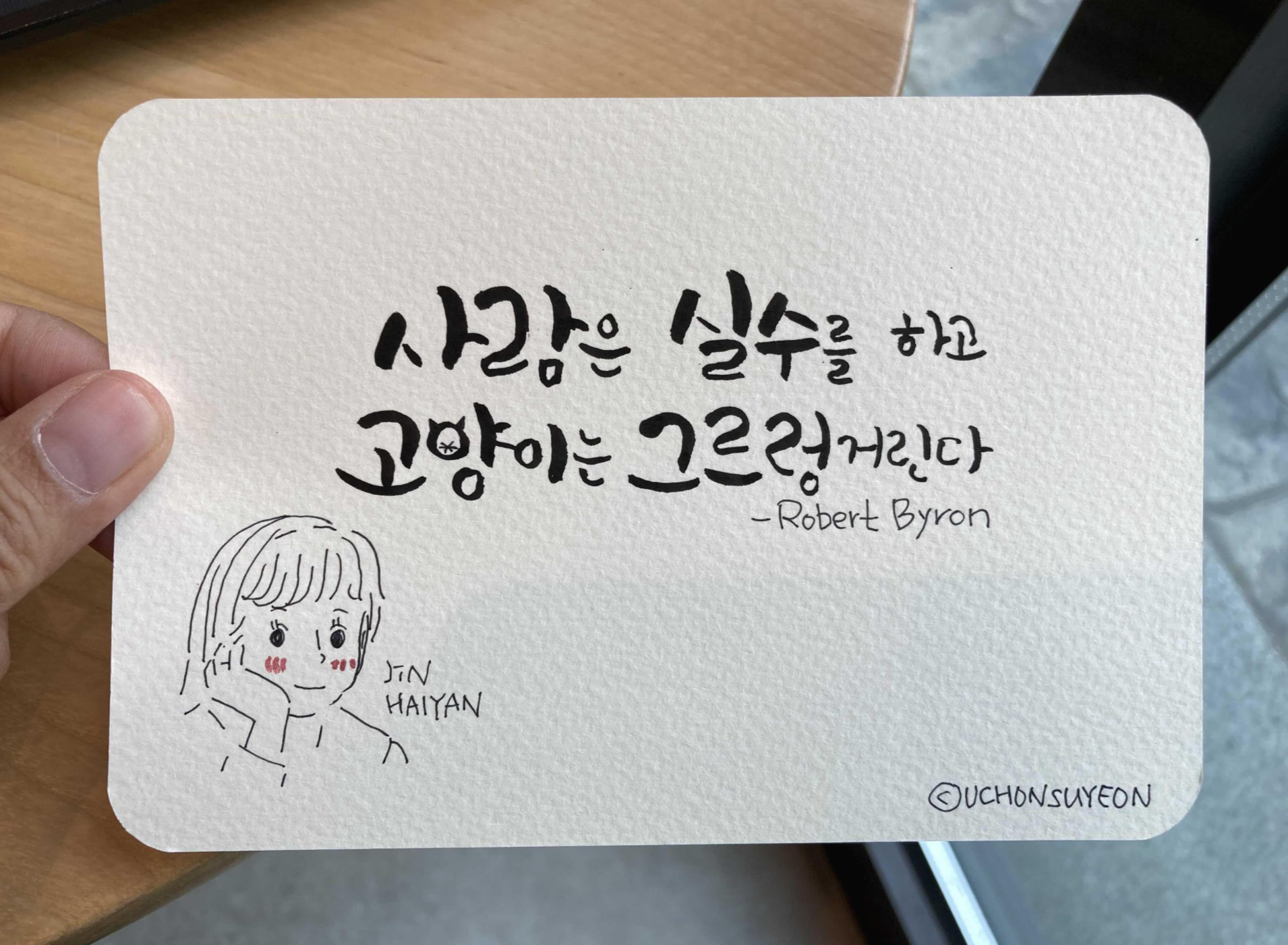 살짝 사진이 흔들렸네 아쉽게도. 오늘 만났던 분께 선물하면서 여자친구 분의 것도 같이 제작했다. 연습한번하고 바로 썼는데 재밌게 나와서 마음에 든다. 글씨를 쓰면서도 키득거렸다. 이런 위트 너무 좋아.