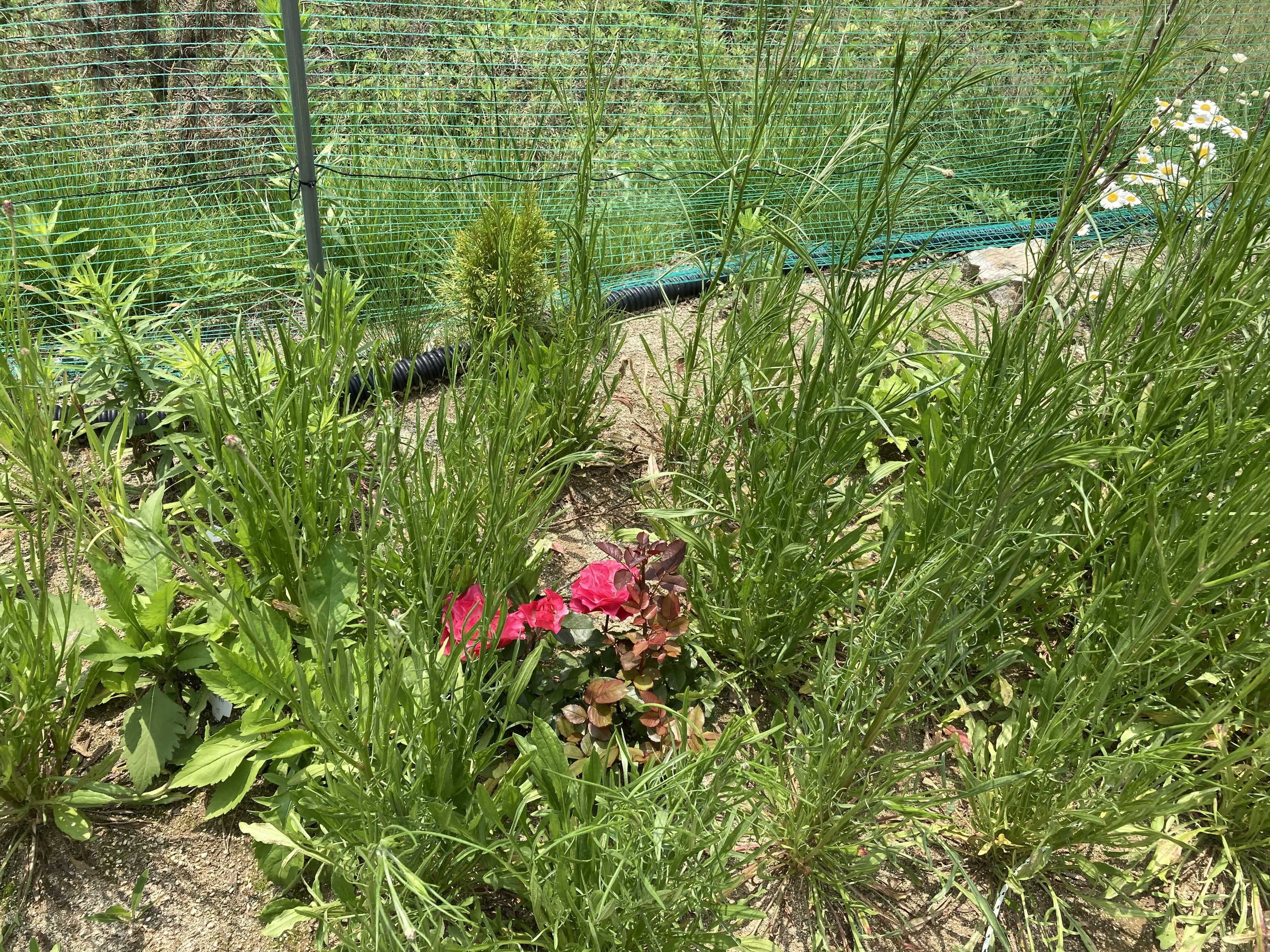 수레국화는 일주일 사이에 훌쩍 커버려서 거의 1m는 된다. 장미를 가려버렸다. 장미들은 애벌레와 풍뎅이 녀석들이 다 야금야금 먹어버렸다. 둘째가 튤립은 다 파고 꺾어버린 사고 후 가장 크게 멘털이 털렸다.