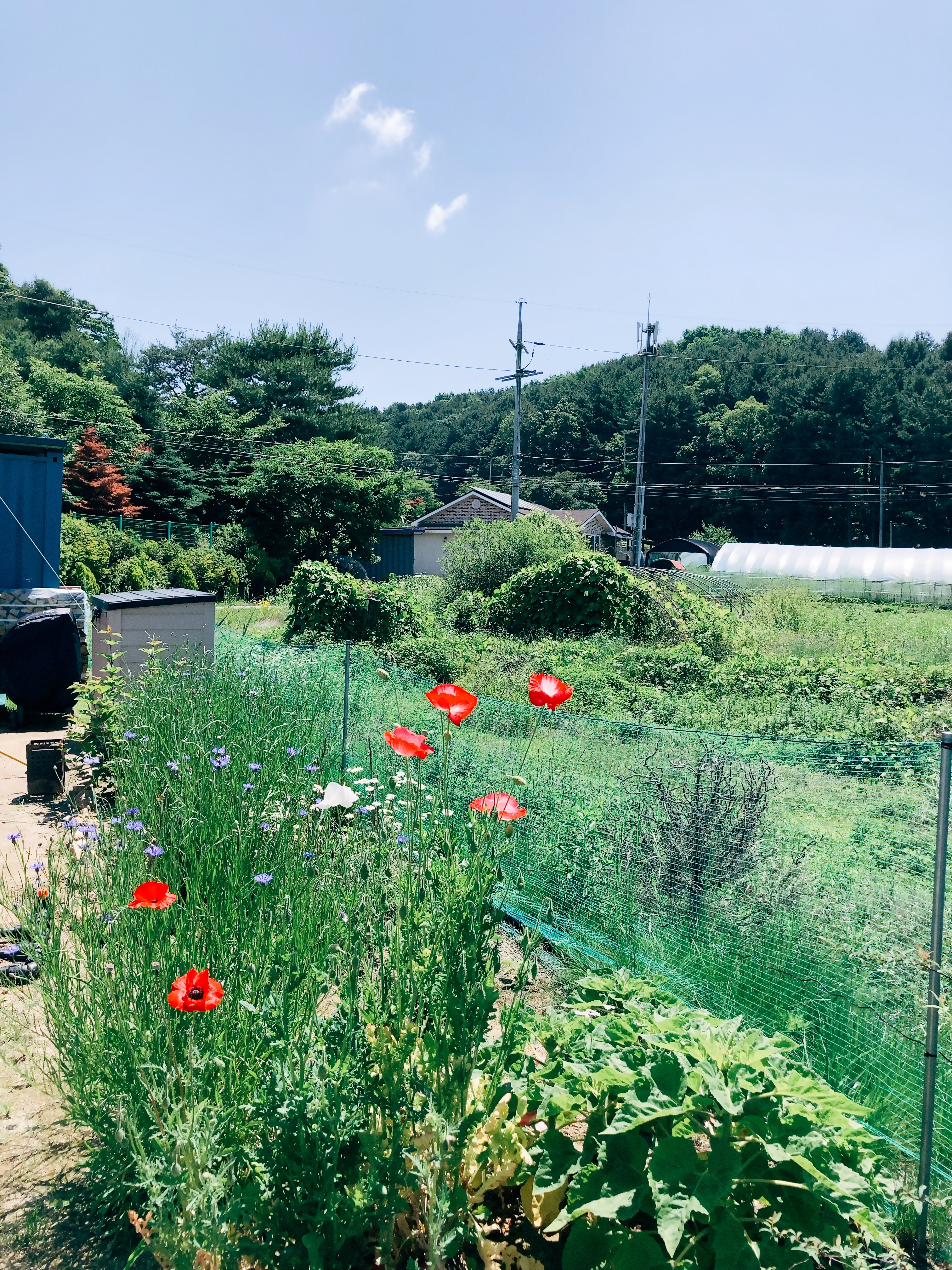 주차장 옆에 심어둔 식물들도 꽃을 피웠다. 코스코스까지도. 아빠말씀이 88올림픽하면서 여름에 피는 코스모스종을 러시아에서 들여왔기때문에 이 계절에도 핀다고 한다. 코스모스 참 이쁜데, 내 밭에 있으면 무섭다. 엄청나다. 성장속도도 그렇고 잠식력도 그렇고 번식력도 그러하다. 무서운 종이다. 쑥대밭만든다는데, 나는 쑥대코스모스밭만든다고 말하고 싶다. 아, 그리고 여기는 퇴비를 덜했는지 서양양귀비가 작게 피고 있다. 안쪽밭 꽃의 1/4 정도인 듯 싶다. 작고 귀여워.