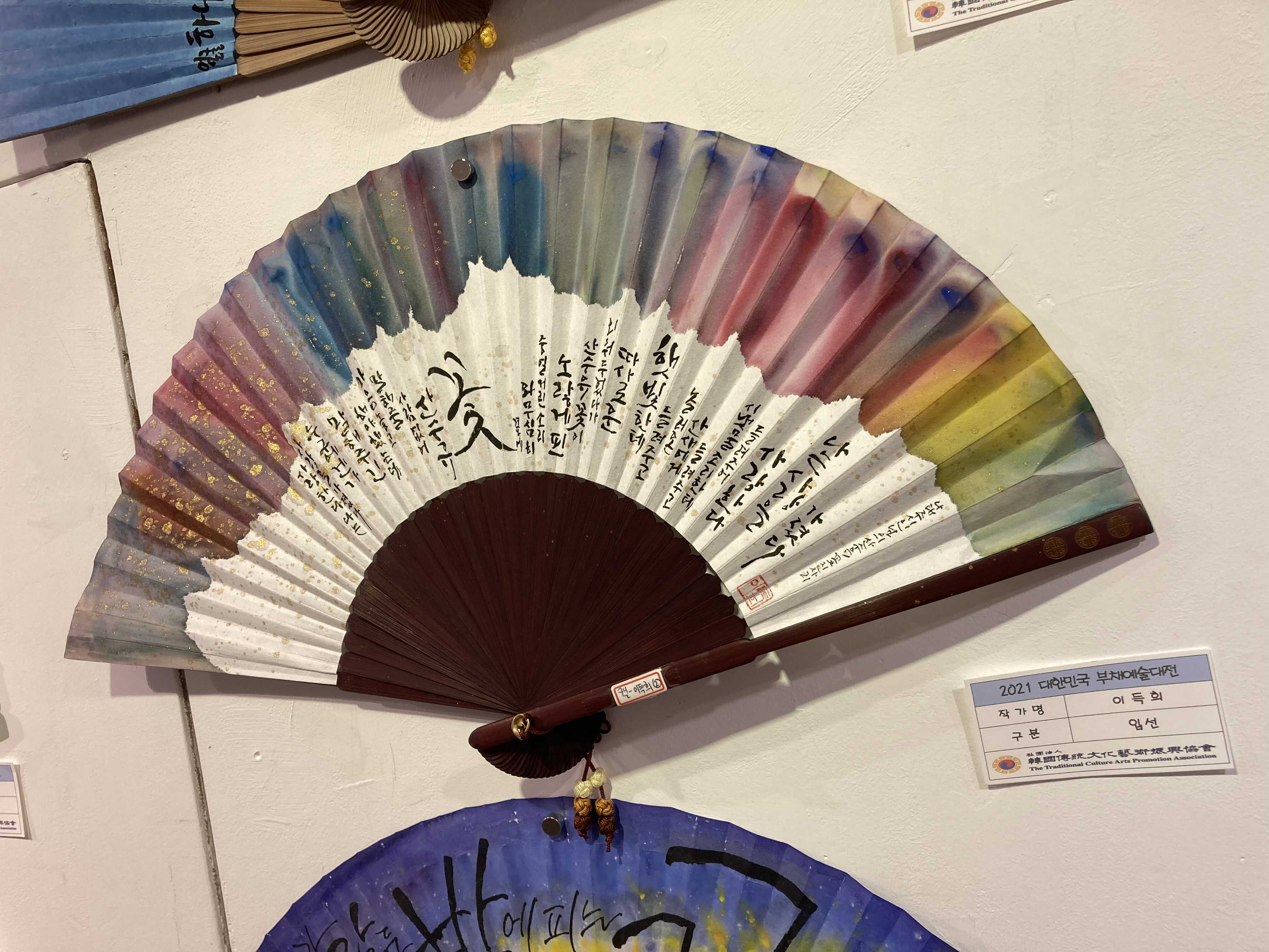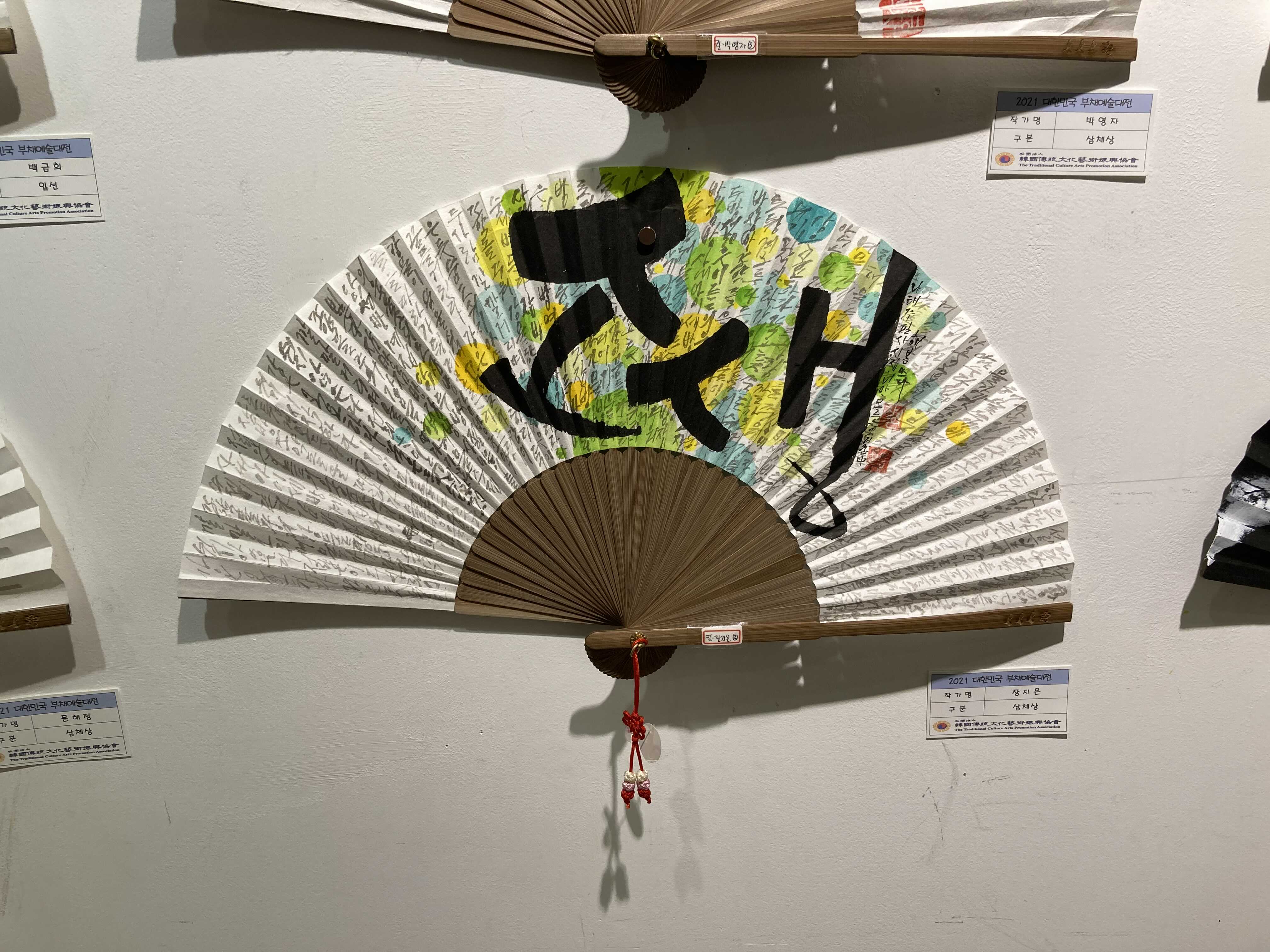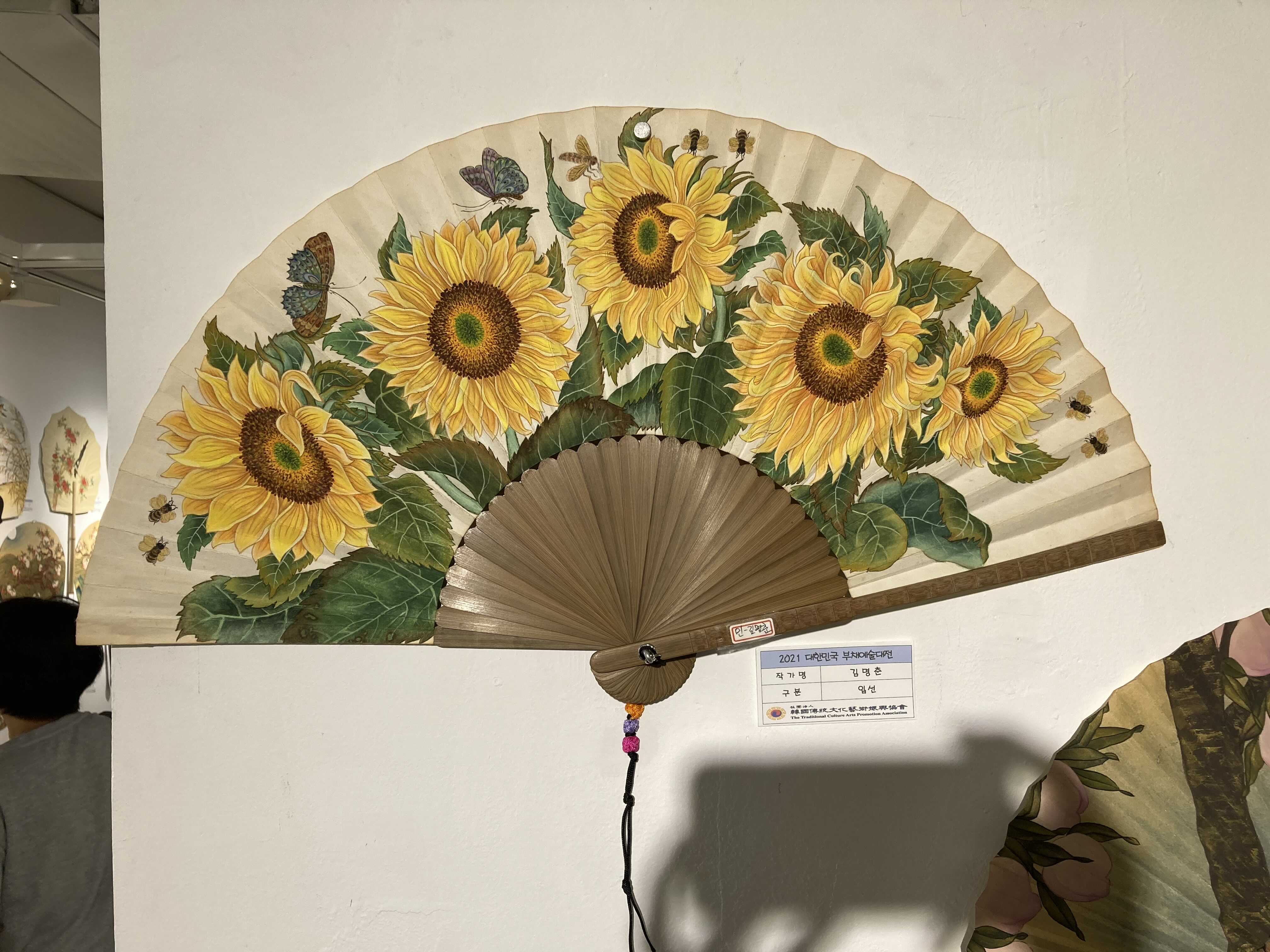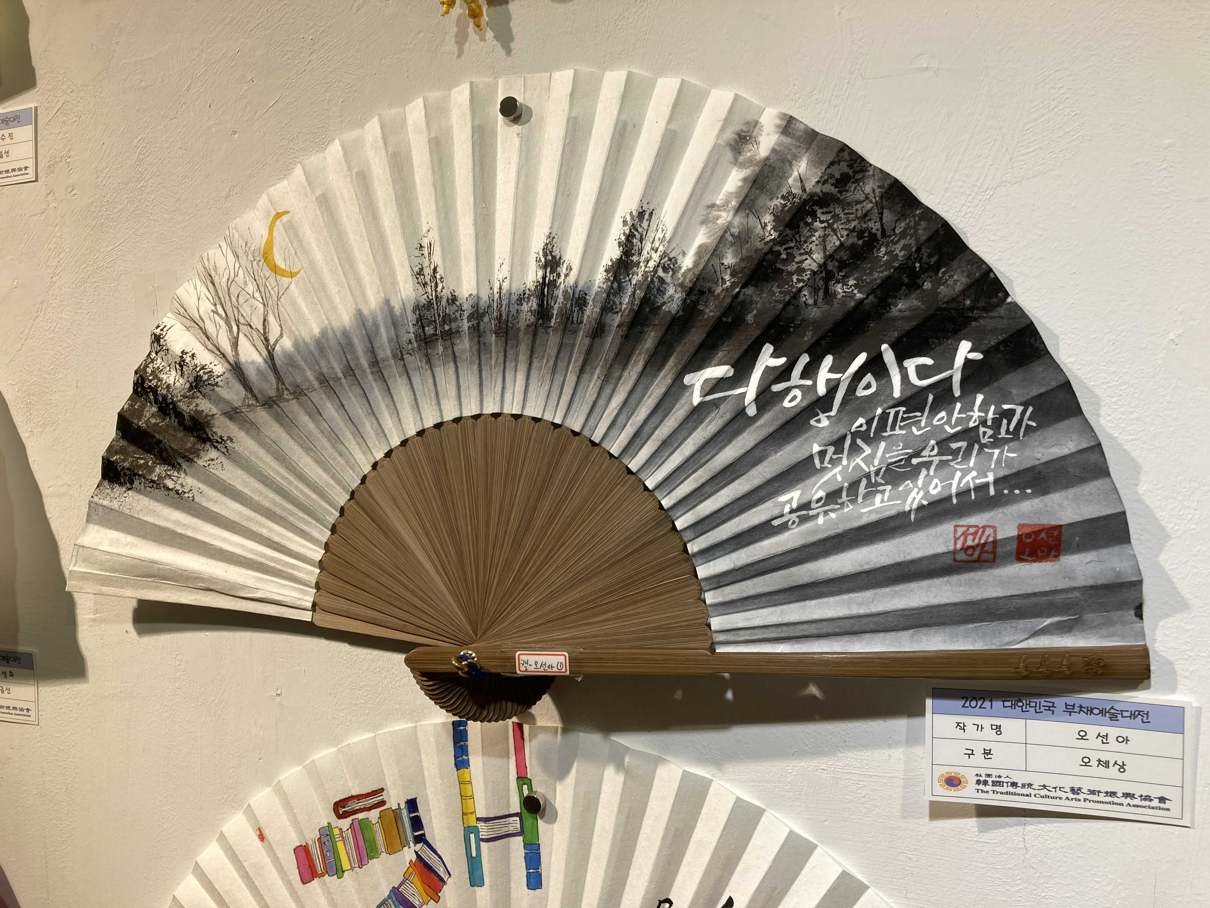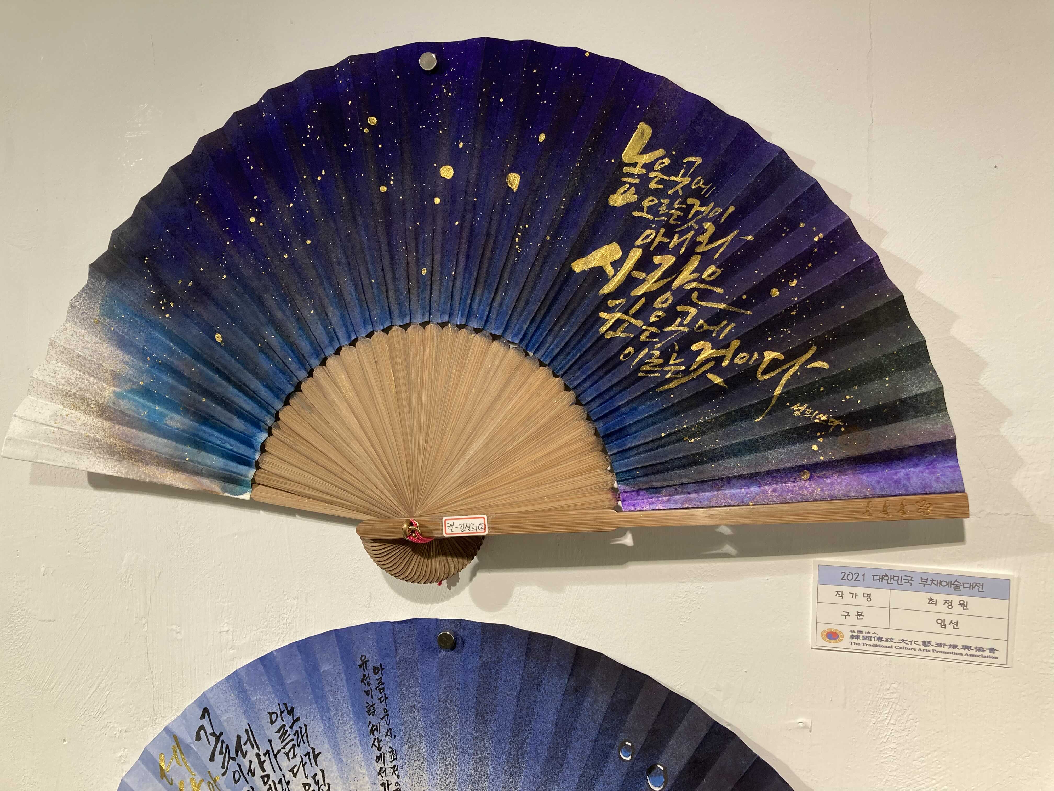 부채대전 전시회는 부채라는 주제로 다양한 작품들이 있었다. 자개부터 가죽까지 있었고 캘리그래피나 서예 등등 다양했다. 민화작품도 많았고. 내 취향 그림이지만 입선정도에 그치는 경우도 많았다. 그만큼 작품이 많았다.