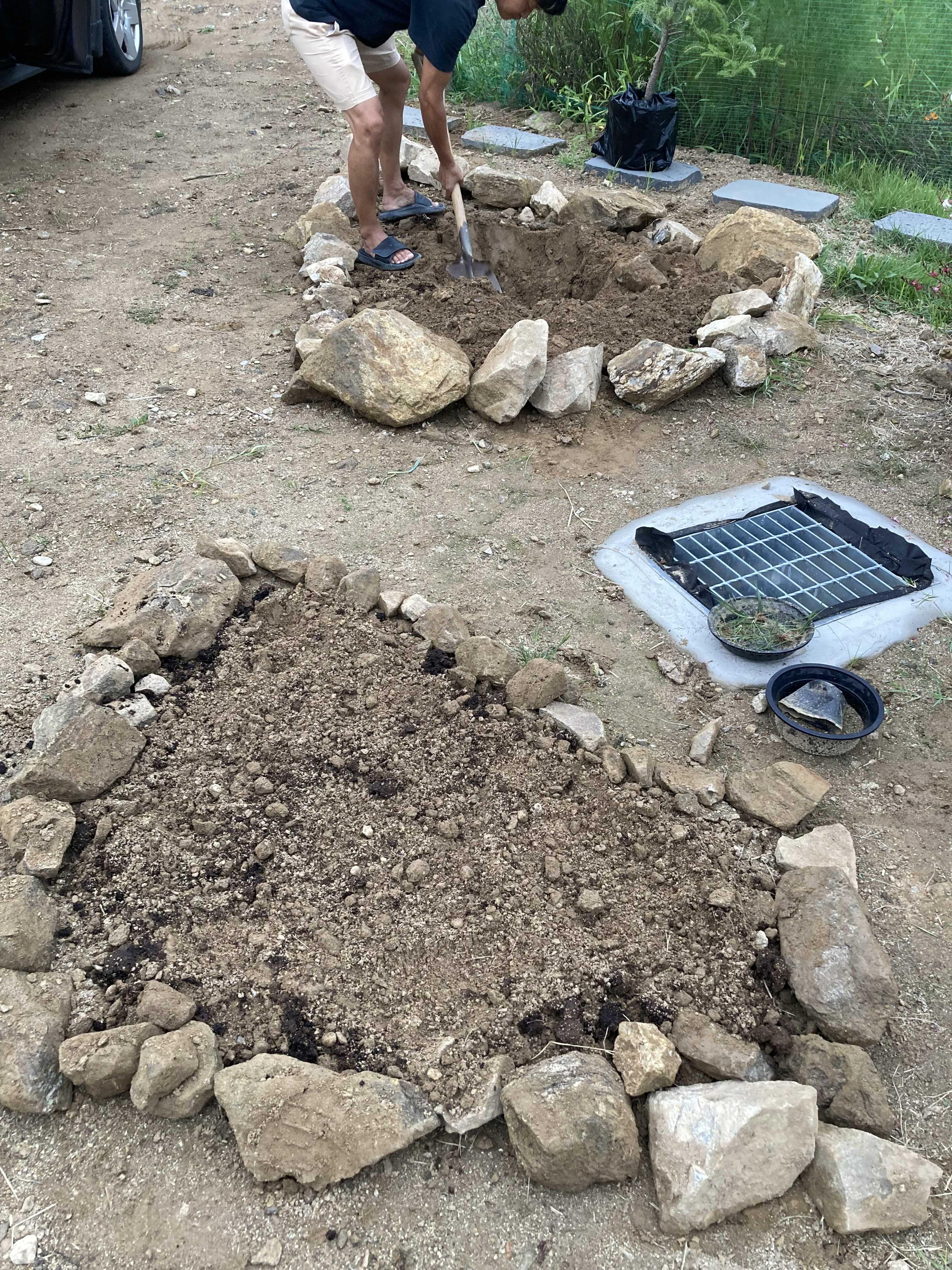 주차장 자리옆에 바위가 좀 쌓여있고 공간이 애매하게 남아서 꽃밭으로 만들기로 했어요. 발단은 남편이 '이 공간이 좀 남는데 꽃밭이나 만들지'라는 말에서 시작했고, 게으르지만 가끔은 부지런한 저는 급하게 돌을 굴려 가드를 만들고 꽃밭 자리를 만들었죠.