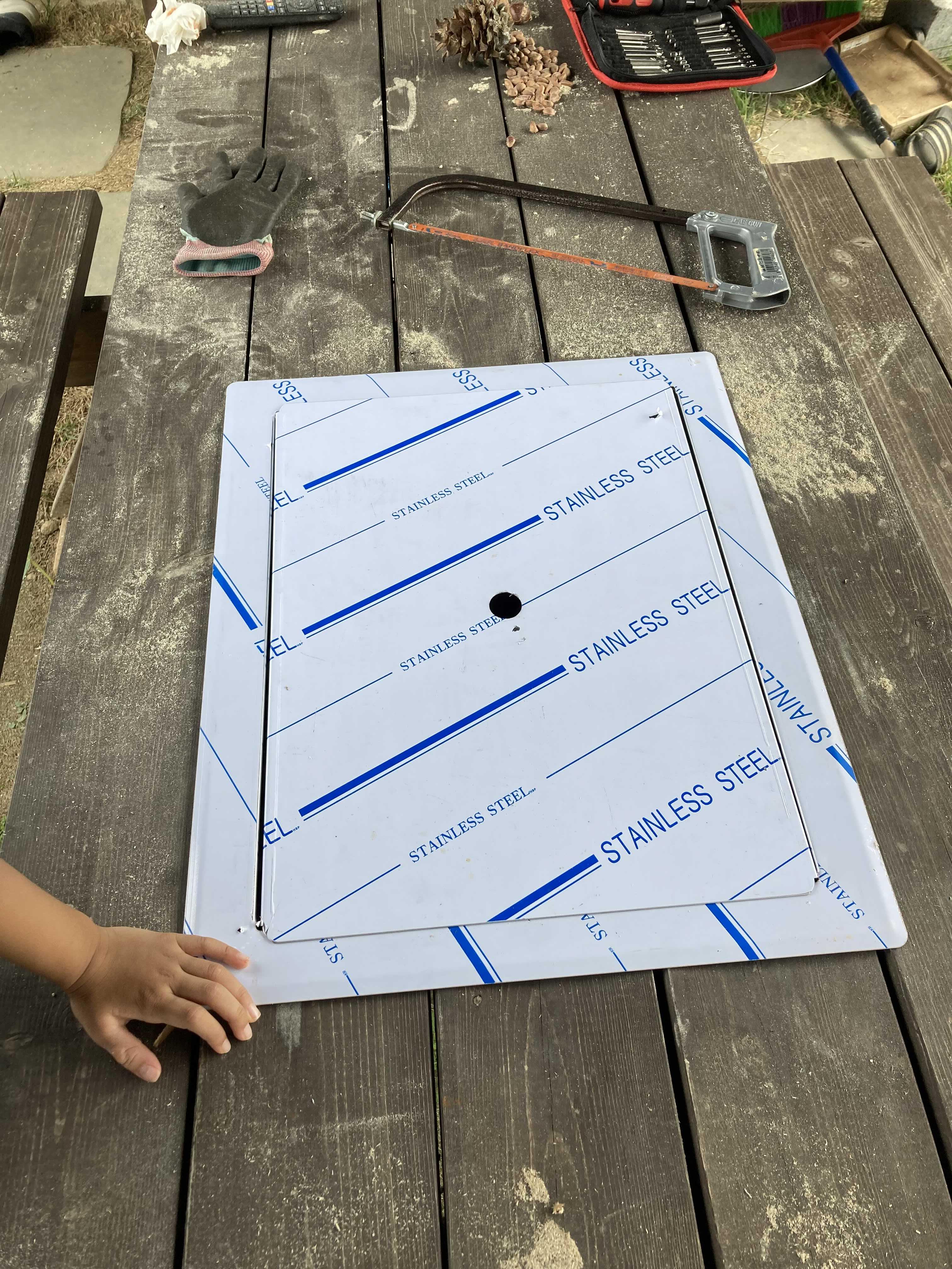 라는 생각을 하다 보니 가게처럼 환경이 같지 않아서 그런 듯하더라고요. 숯불에 구워 거의 바로 먹긴 하지만, 화로에서 바로 꺼내먹는 것과는 다르잖아요? 남편도 같은 고민을 하더니 바로 직화구이 화로대를 주문했네요. 직소가 없어서 어쩔까 하다가 예전에 남편 회사분이 전원주택을 정리하면서 주신 동그란 톱기계 (이름은 잘..)와 줄칼로 이렇게 잘 끼워 넣어 완성했어요!